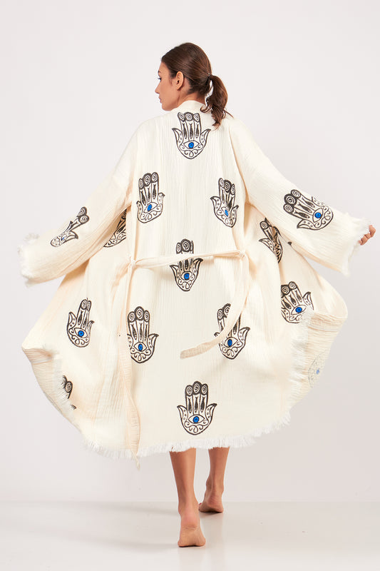 Fatima Hand Kimono Kaftan Robe - Handmade with Natural Cotton, One Size