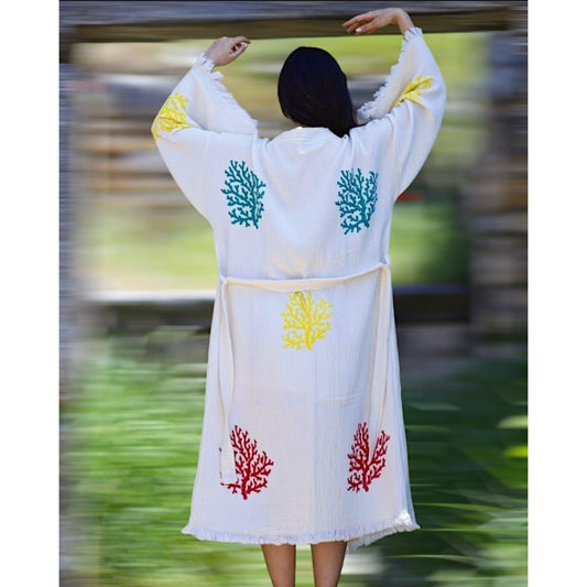 Hand-Made Block Print Coral Turkish Towel Kimono Robe Kaftan