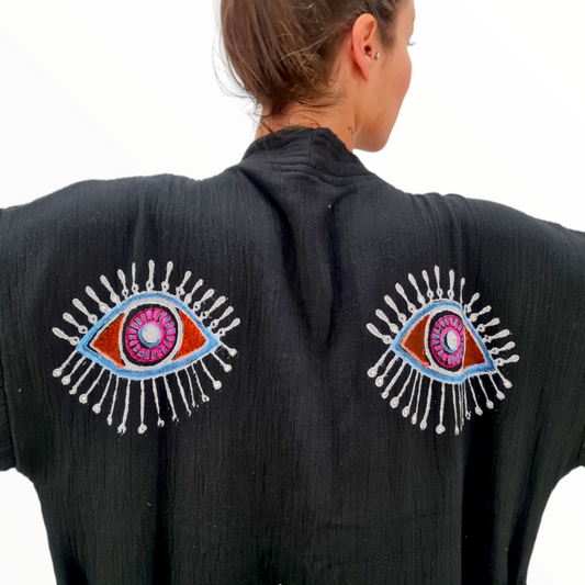 Hand-Made Block Print Evil Eye Black Kimono Robe Kaftan