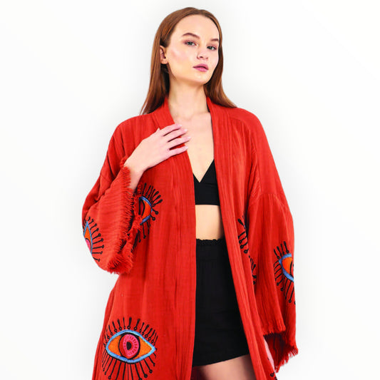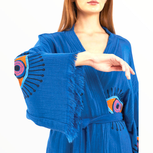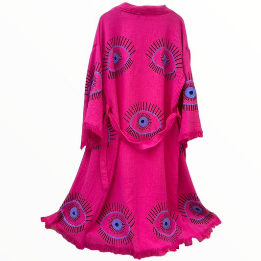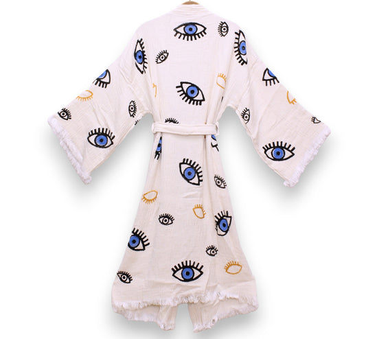 Hand-Made Block Print Evil Eye Turkish Towel Kimono Robe Kaftan