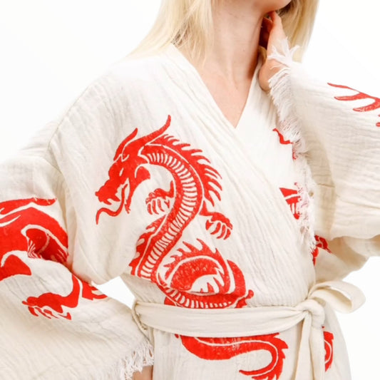 Hand-Made Block Print Dragon Design Turkish Towel Kimono Robe Kaftan