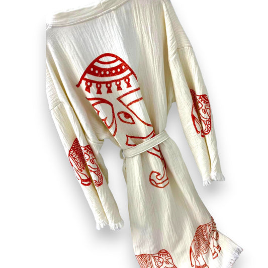 Hand-Made Block Print Turkish Towel Elephant Design Kimono Robe Kaftan
