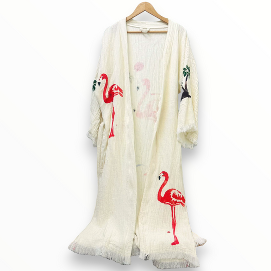Hand-Made Block Print Flamingo Design Turkish Towel Kimono Robe Kaftan