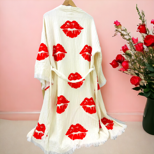 Hand-Made Block Print Lipstick Design Turkish Towel Kimono Robe Kaftan