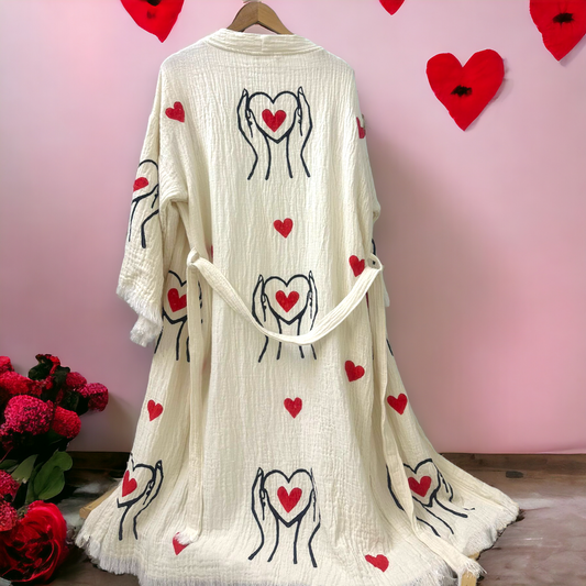 Hand-Made Block Print Love Design Turkish Towel Kimono Robe Kaftan