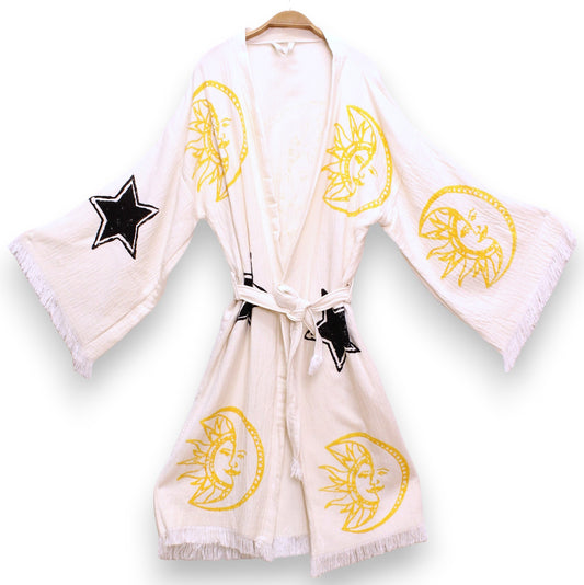 Hand-Made Block Print Moon Star Turkish Towel Kimono Robe Kaftan