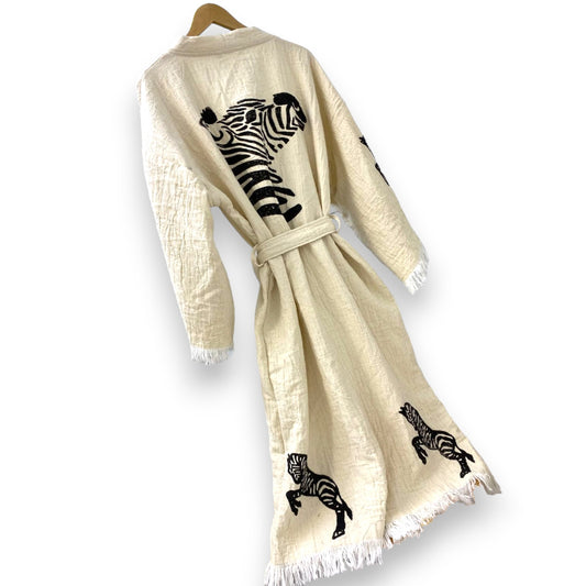 Hand-Made Block Print Turkish Towel Zebra Design Kimono Robe Kaftan