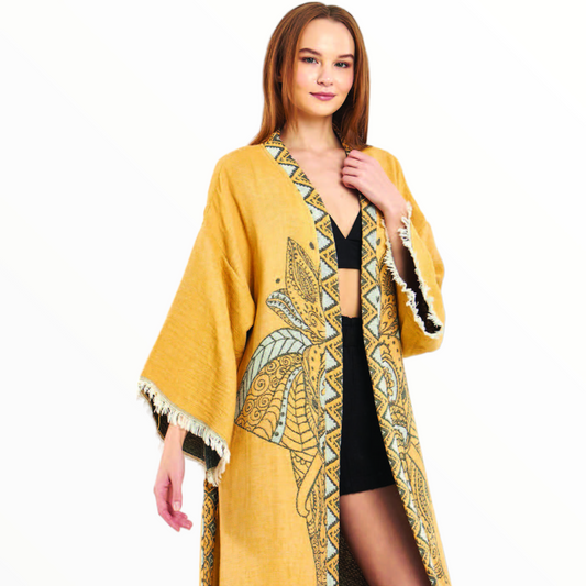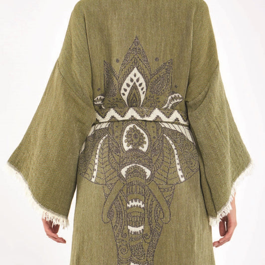 Hand-Woven Hand-Made Natural Cotton Turkish Towel Kimono Kaftan with an Elephant Design