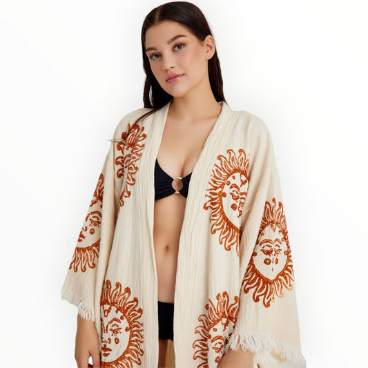 Hand-Woven Natural Cotton Brown Sun Pattern Turkish Towel Kimono