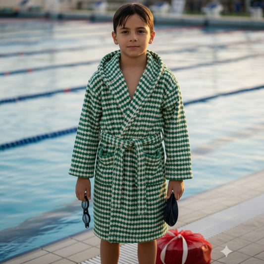 Handwoven Natural Turkish Cotton Terry Kids Bathrobe – PomPom Design Green