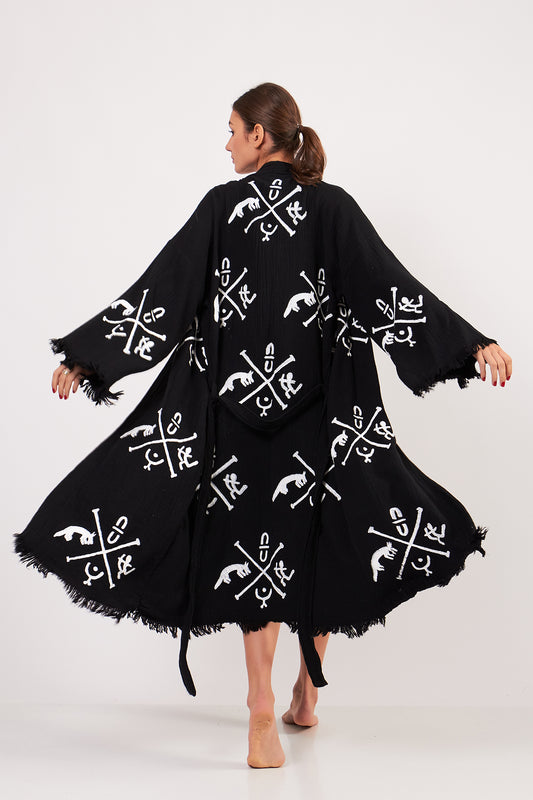 Turkish Towel Kimono Bathrobe Ancient Design Black