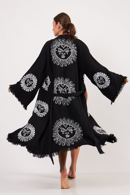 Turkish Towel Kimono Bathrobe Sun Design Black