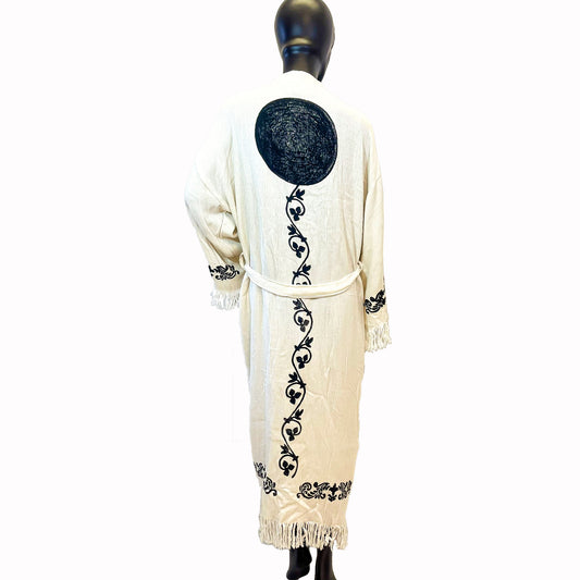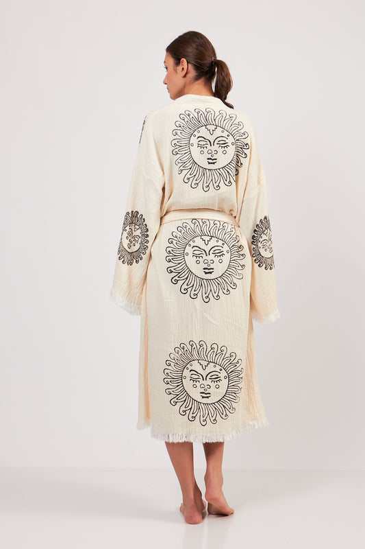 Turkish Towel Kimono Bathrobe Sun Design Black on Ecru