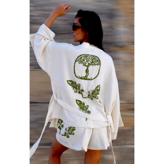 Natural Cotton Hand-Made Olive Tree Beach Kimono Kaftan Set