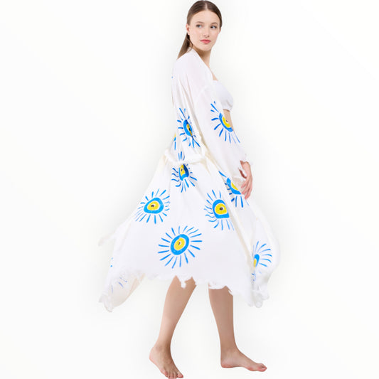 Natural Cotton Turkish Towel Evil Eye Kimono Robe & Towel Set