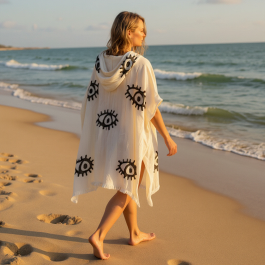 Evil Eye Turkish Towel Surf Poncho - Black on Ecru