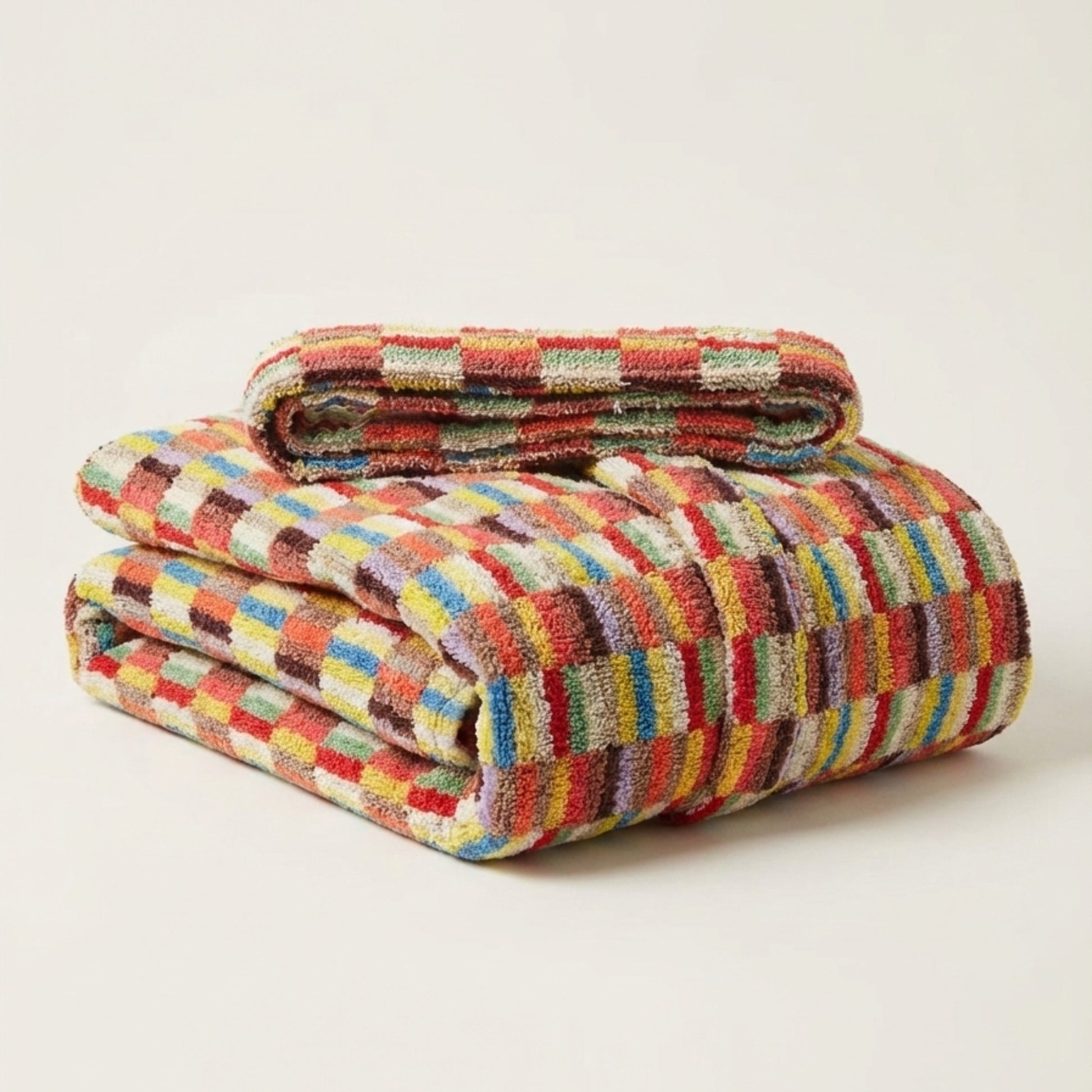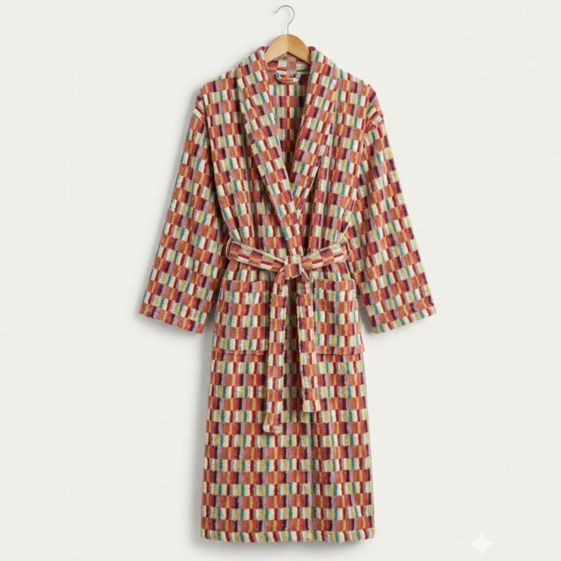 Hand-woven in Turkey using 100% natural cotton, this bathrobe features a distinctive multicolor mosaic pattern, inspired by Anatolian tile art and traditional textiles. Each color block is carefully woven, creating a rich visual texture that feels as special as it looks.