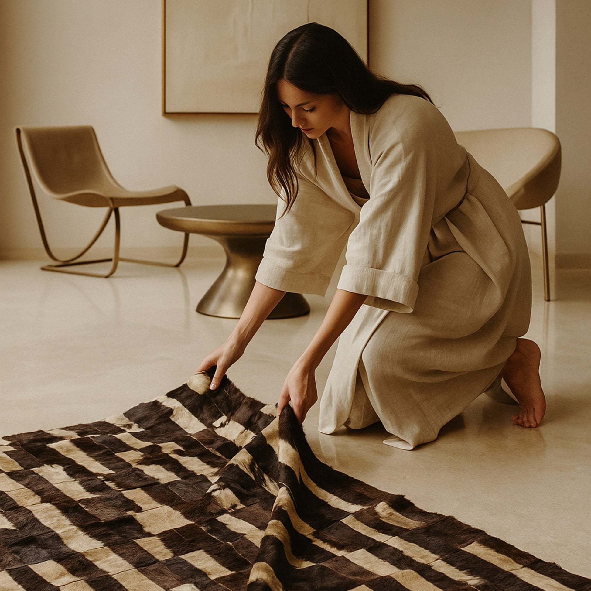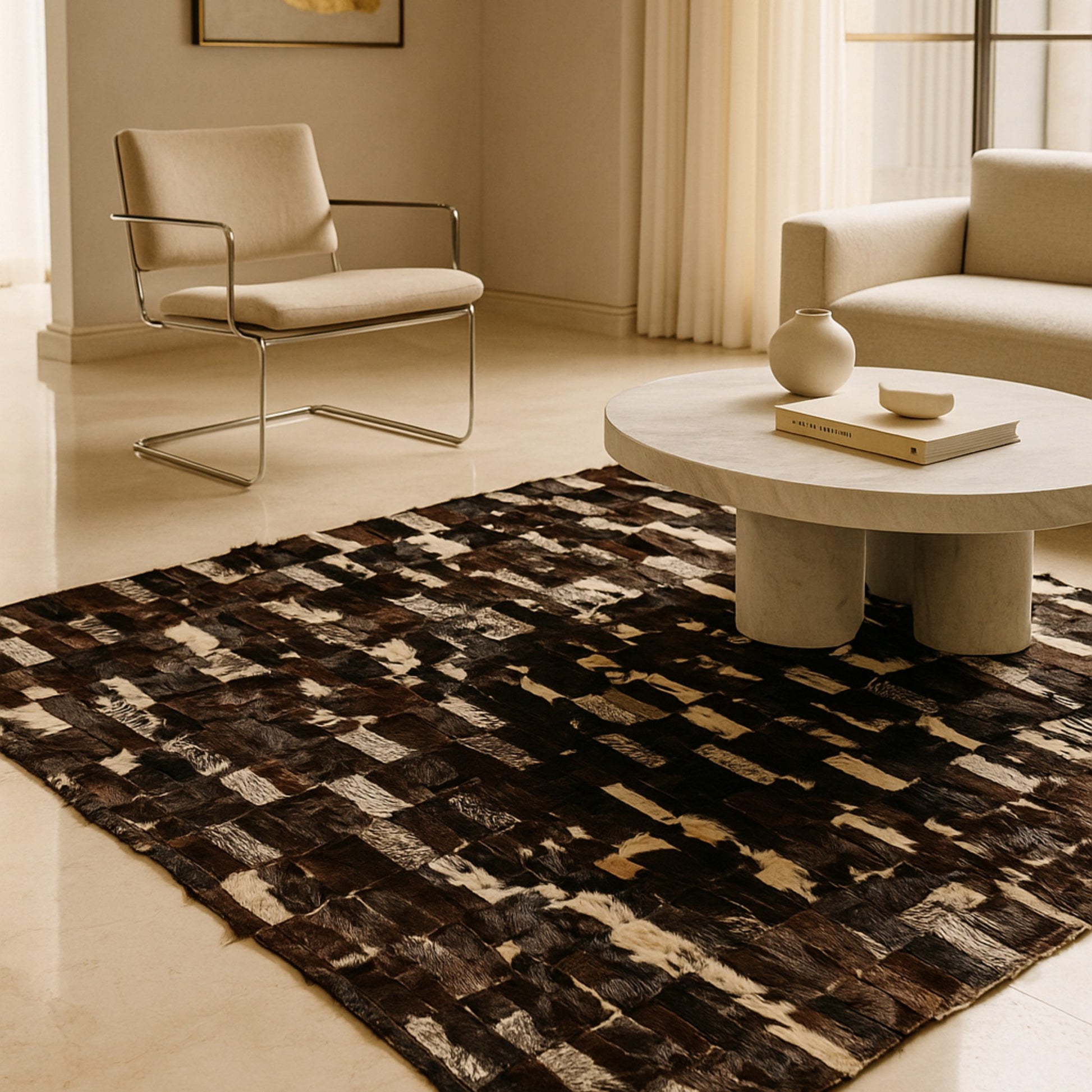 Bring timeless elegance and conscious craftsmanship into your home with our Antilop Leather Patchwork Rug — a masterpiece of sustainability and artistry.