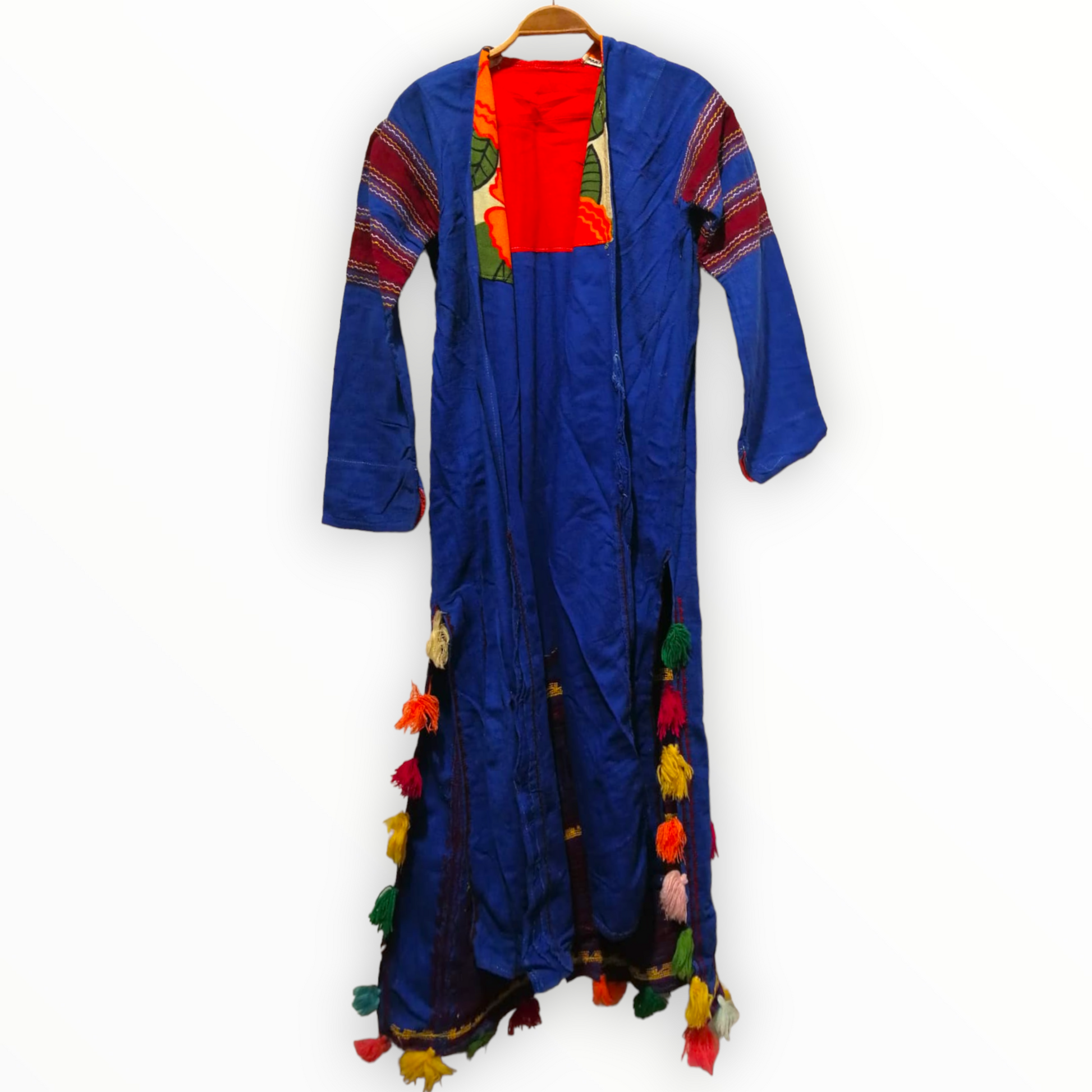 Antique Alevi Turkmen Dress is used for festival ceremonies. Natural cotton is used with beautiful embroidery at the bottom with beads.  The local traditional dress is designed with colorful patchwork, embroidery, woolen tassels, and beadwork.