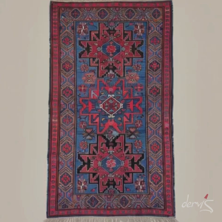Its intricate geometric motifs, rich red and deep blue tones, and precise craftsmanship reflect the Caucasian Sumak weaving technique, celebrated for its texture, durability, and artistry.