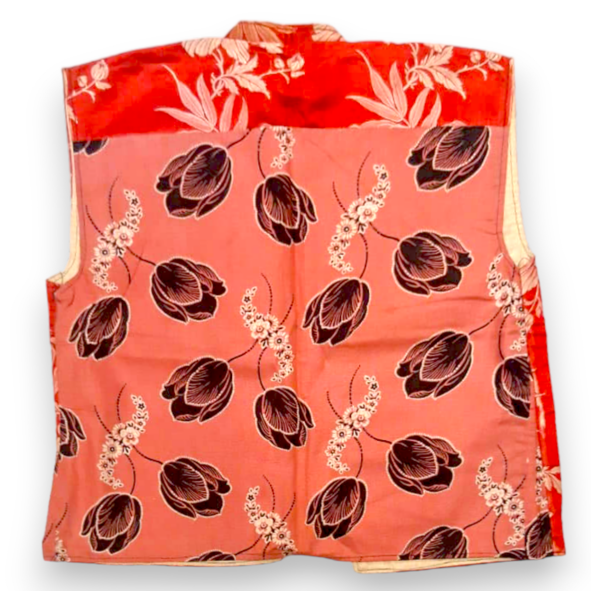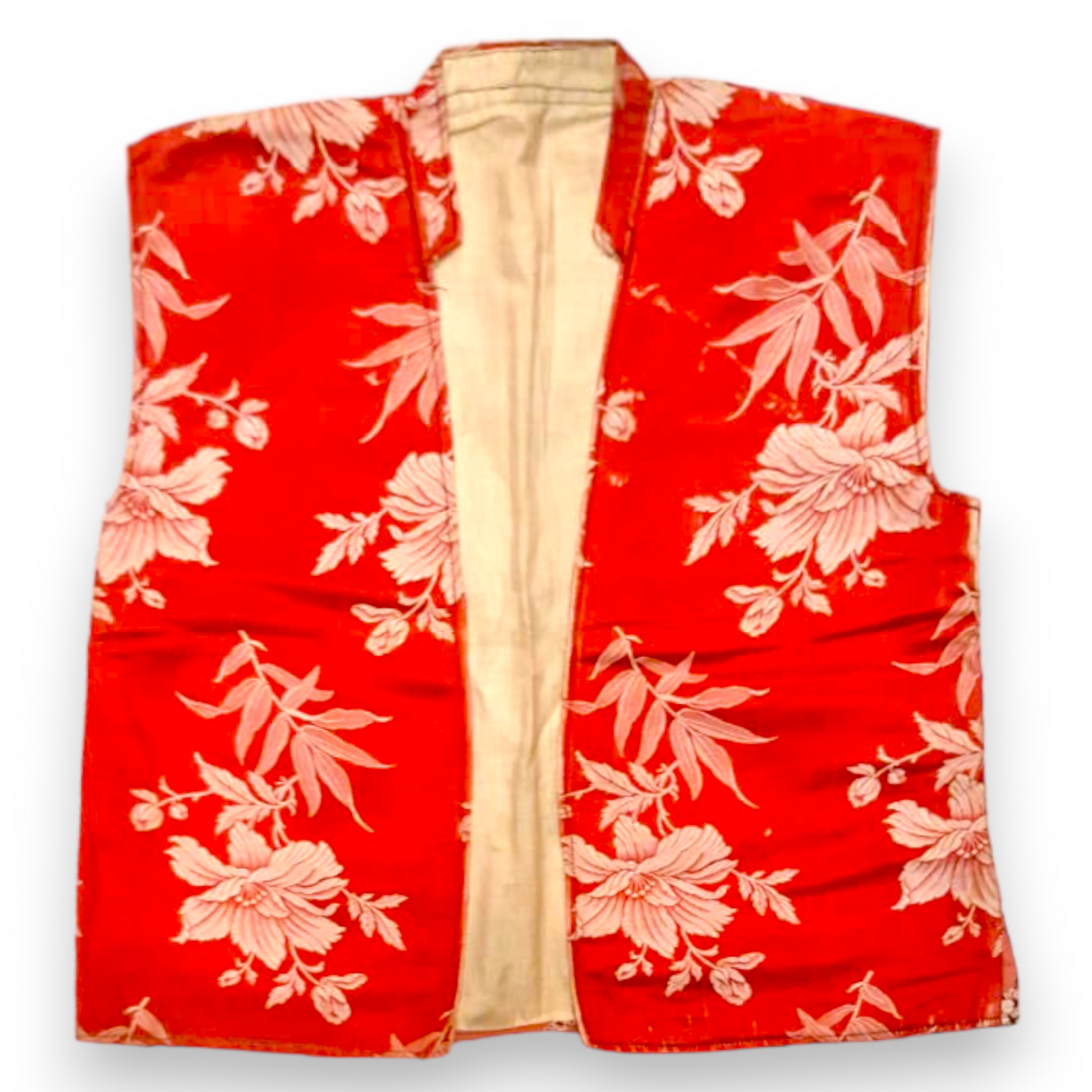 Beautiful flower patterns on a handwoven red base. Inside is ecru hand-woven base fabric. Completely hand stitch.  Hand made button are very well preserved.