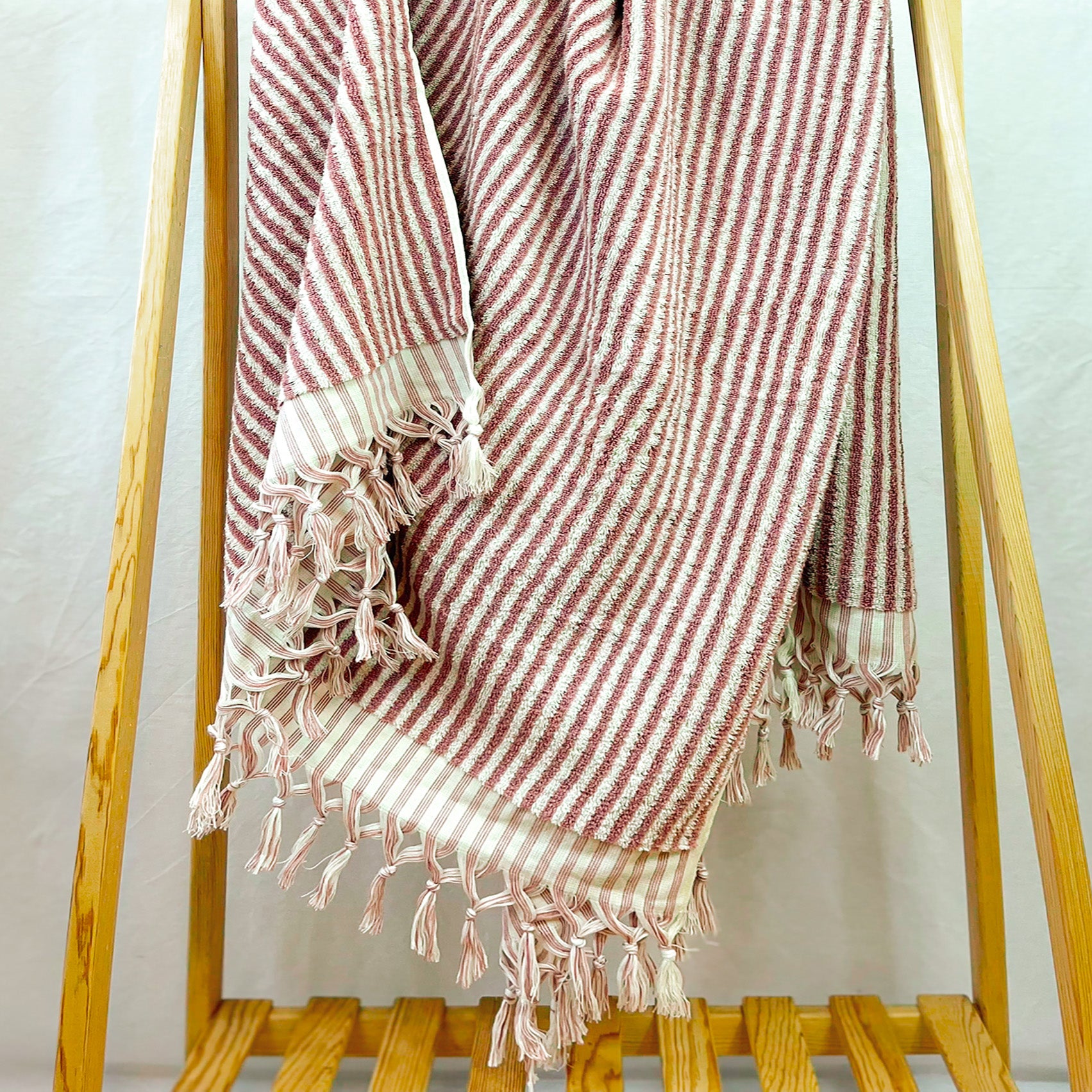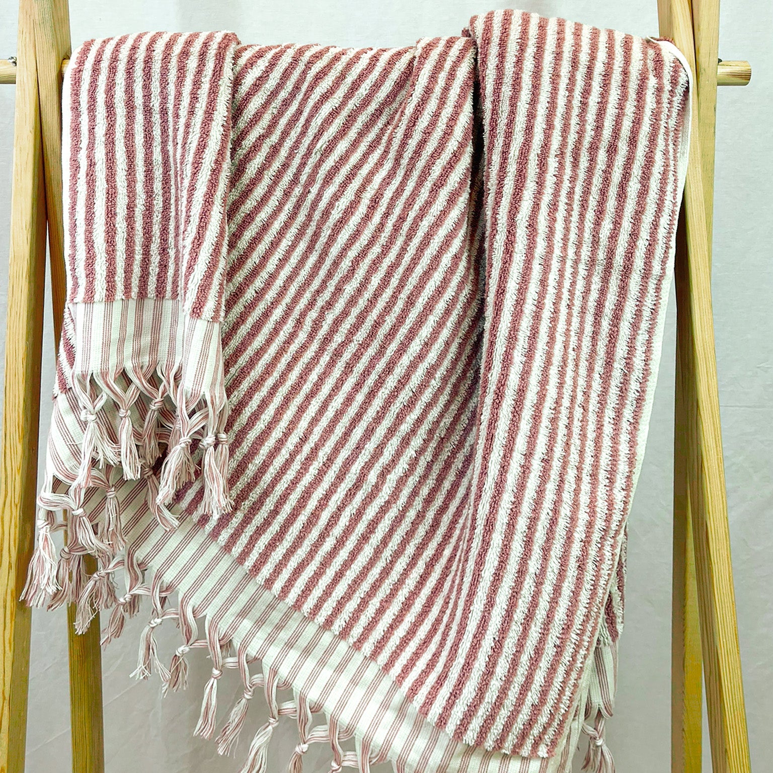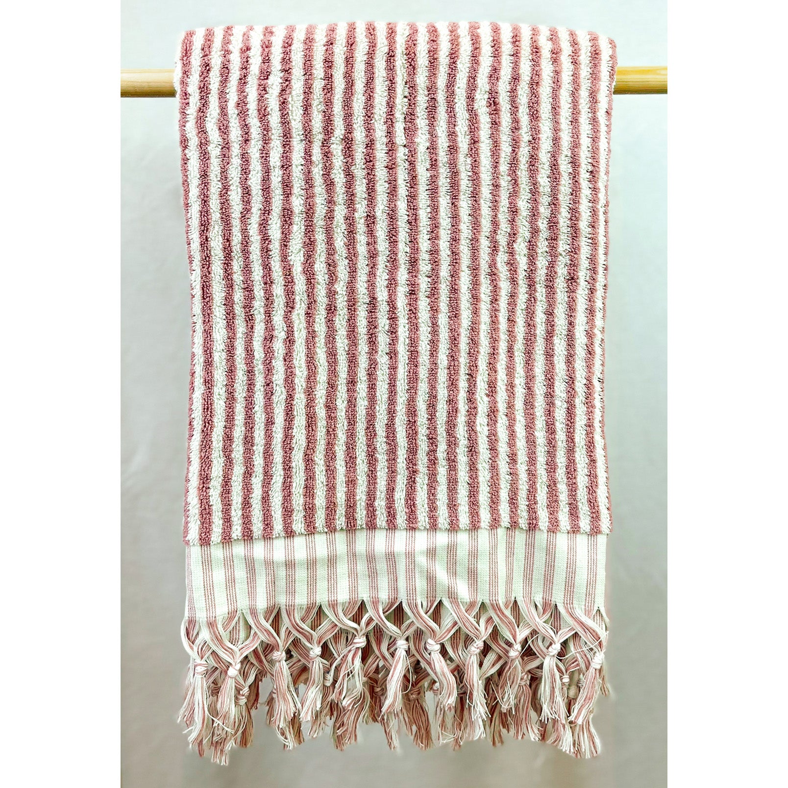 Turkish Bath Hammam Towel Rose Stripe is woven exceptionally by artisans in the villages of Middle Anatolia with the old wooden looms. The family who makes these towels are the third generation in this business.