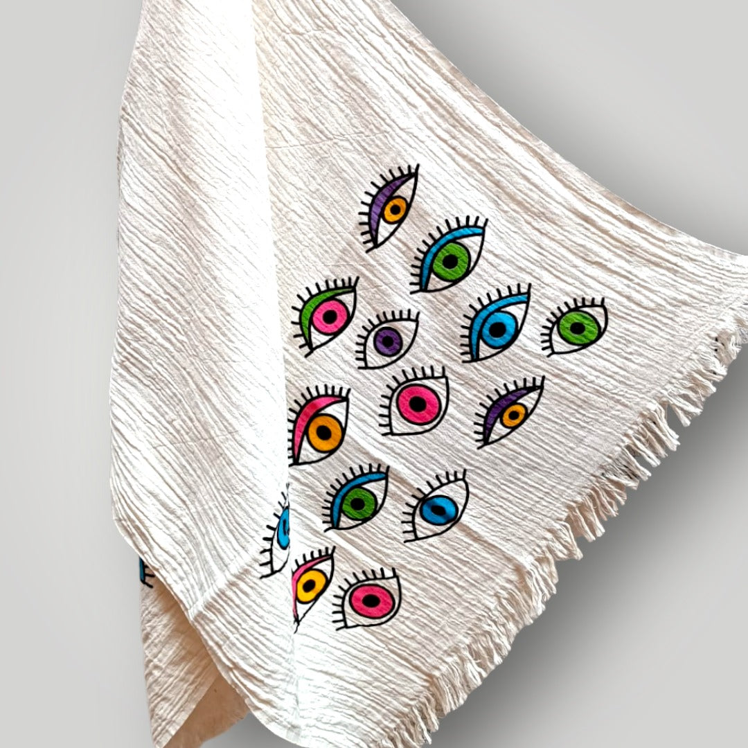 Our Evil Eye Turkish Towel Pestemal Beach Towel is made from high-quality Turkish cotton and features a beautiful double-layered natural cotton muslin. Traditional wood stamps and natural dyes are used to handprint Evil Eye motifs onto each towel.