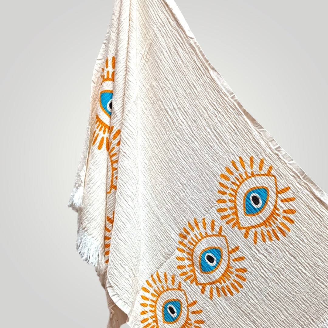 Our Evil Eye Turkish Towel Pestemal Beach Towel is made from high-quality Turkish cotton and features a beautiful double-layered natural cotton muslin. Traditional wood stamps and natural dyes are used to handprint Evil Eye motifs onto each towel.