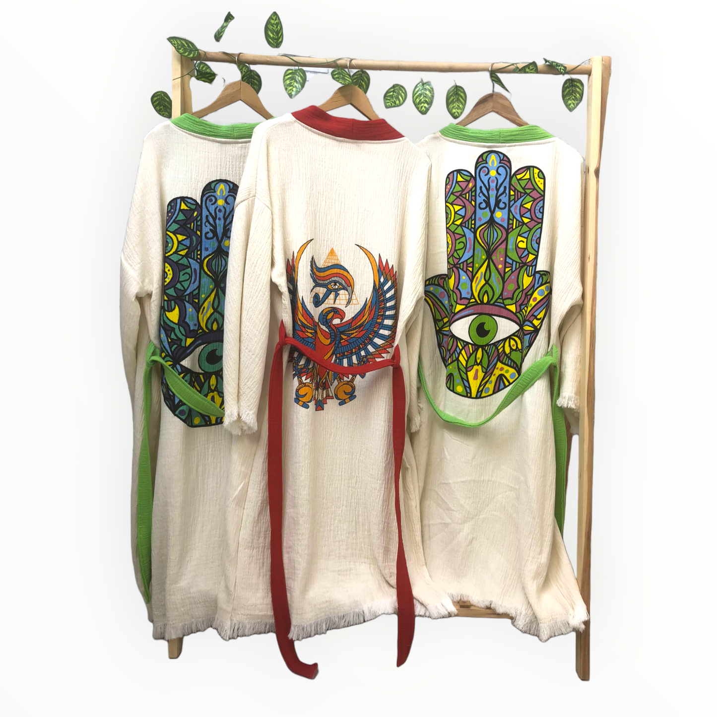 Fatima Hand Kimono Kaftan Robe - Handmade with Natural Cotton, One Size