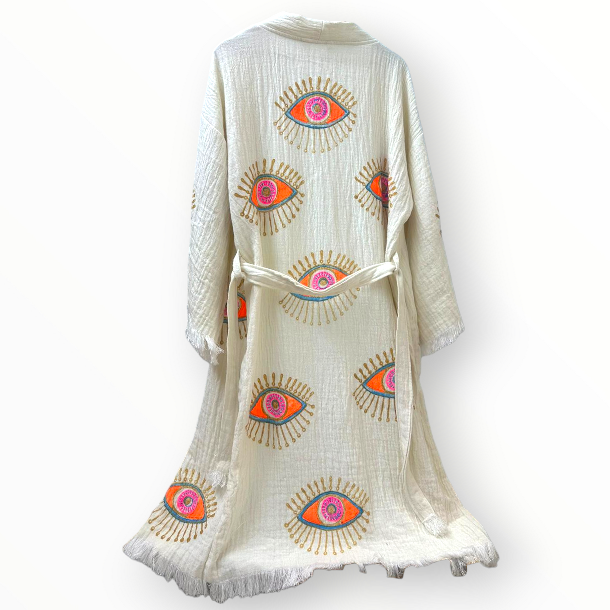 Hand-Made Block Print Evil Eye Turkish Towel Kimono Robe Kaftan