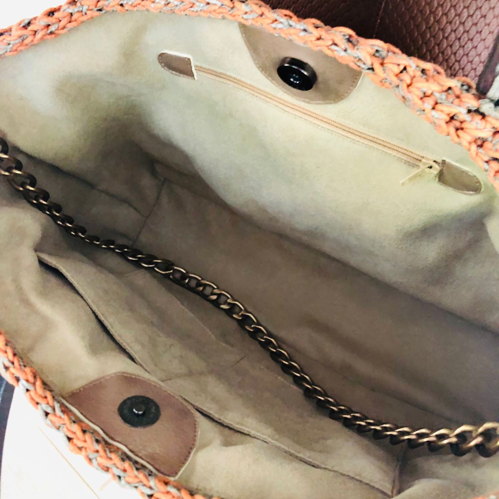 Hand-Made Hand Knitted Hand Bag With Painted Handles includes inner pockets.