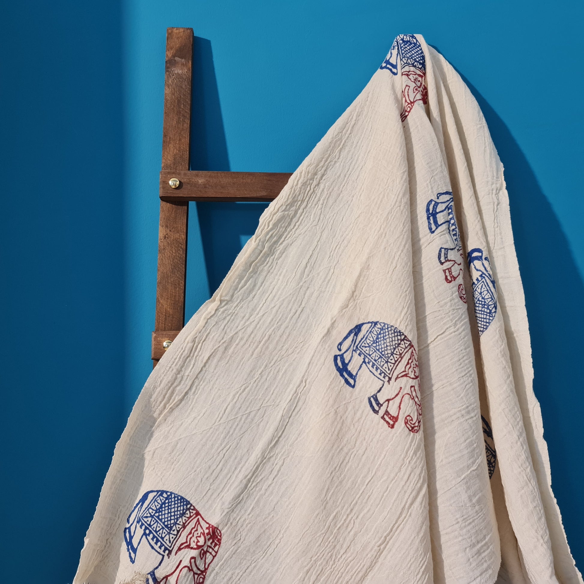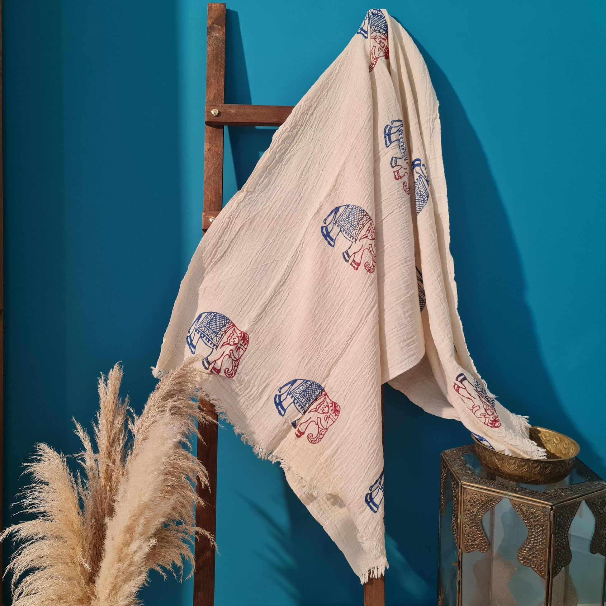 Hand Print Elephant Design Turkish Towel Pestemal is not only a towel but also a sarong, fouta, or an exceptional scarf for four seasons.