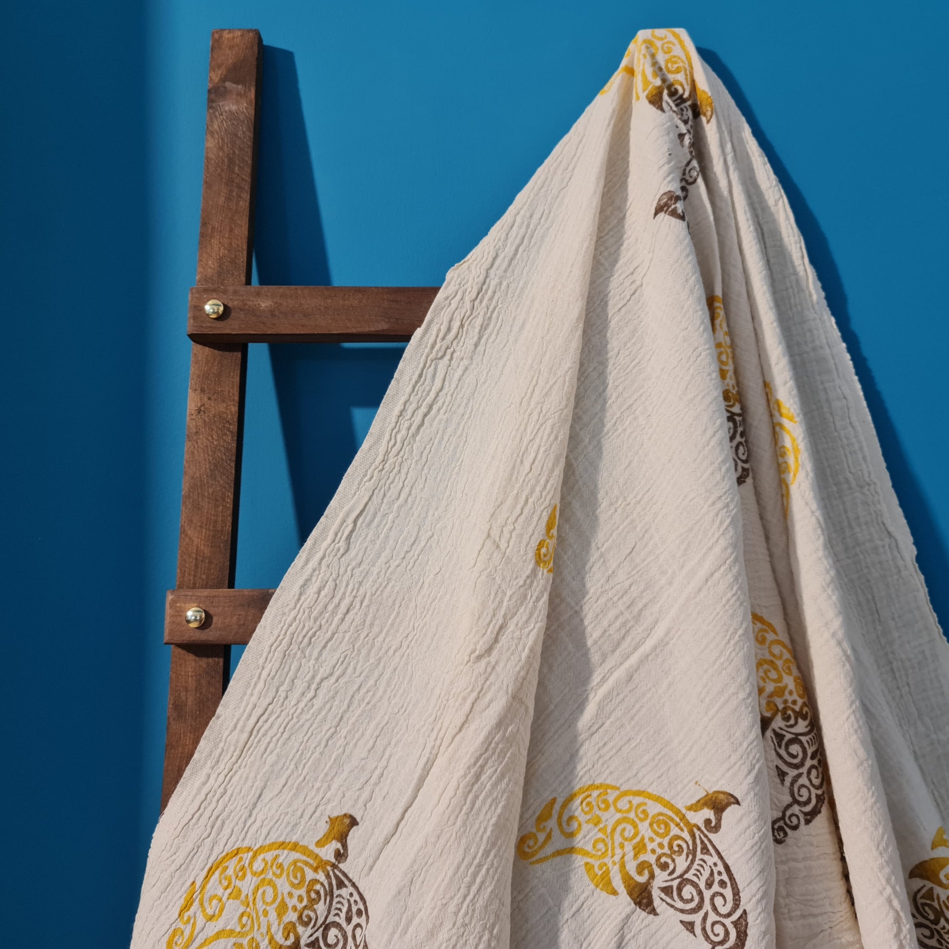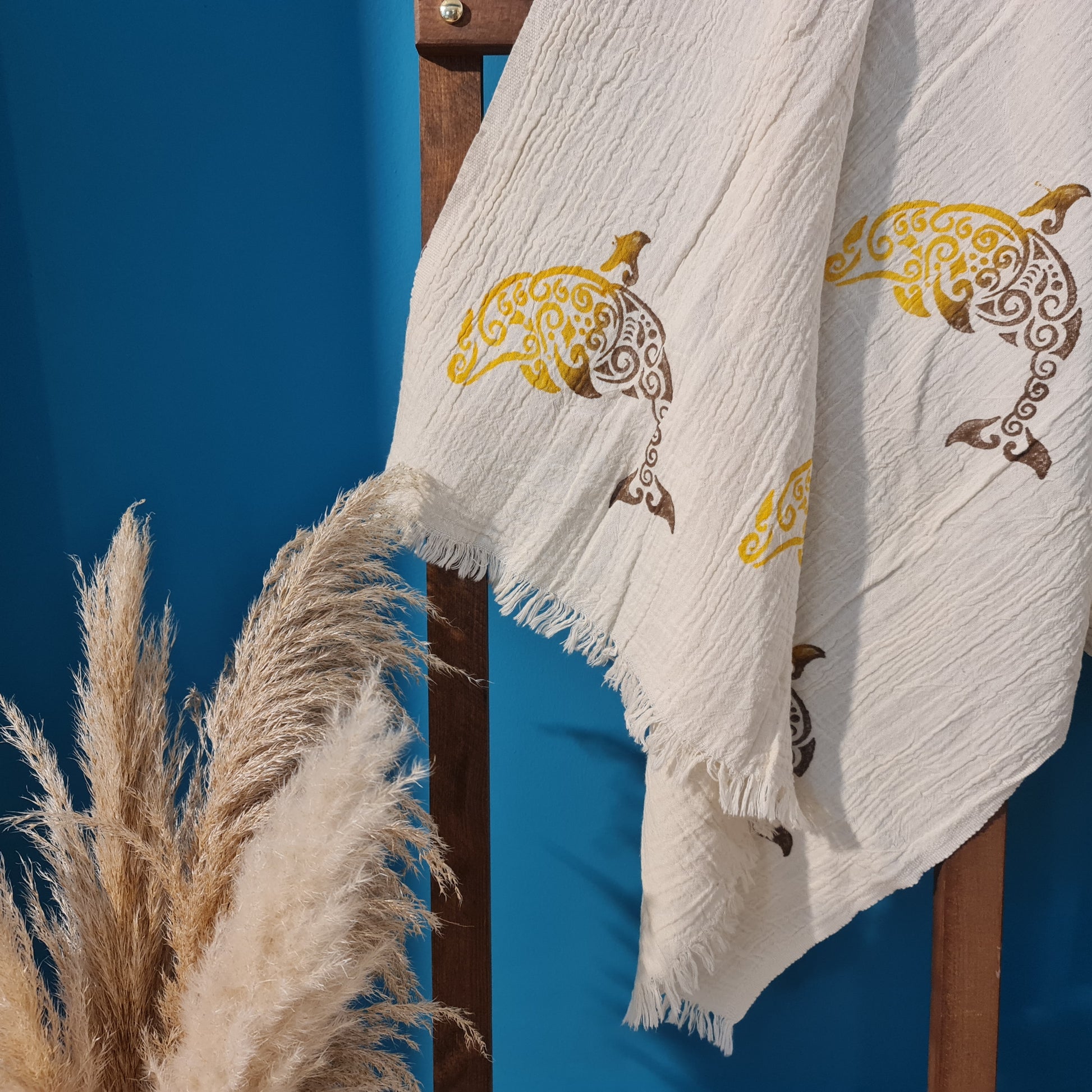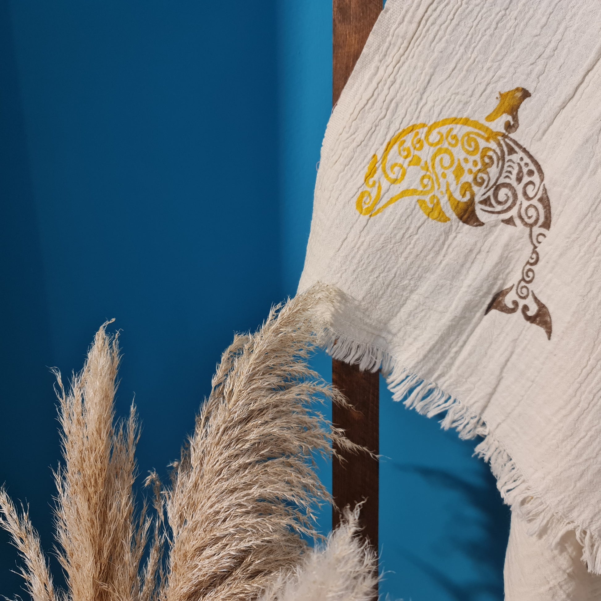 Hand Print Fish Design Turkish Towel Pestemal is not only a towel but also a sarong, fouta, or an exceptional scarf for four seasons.