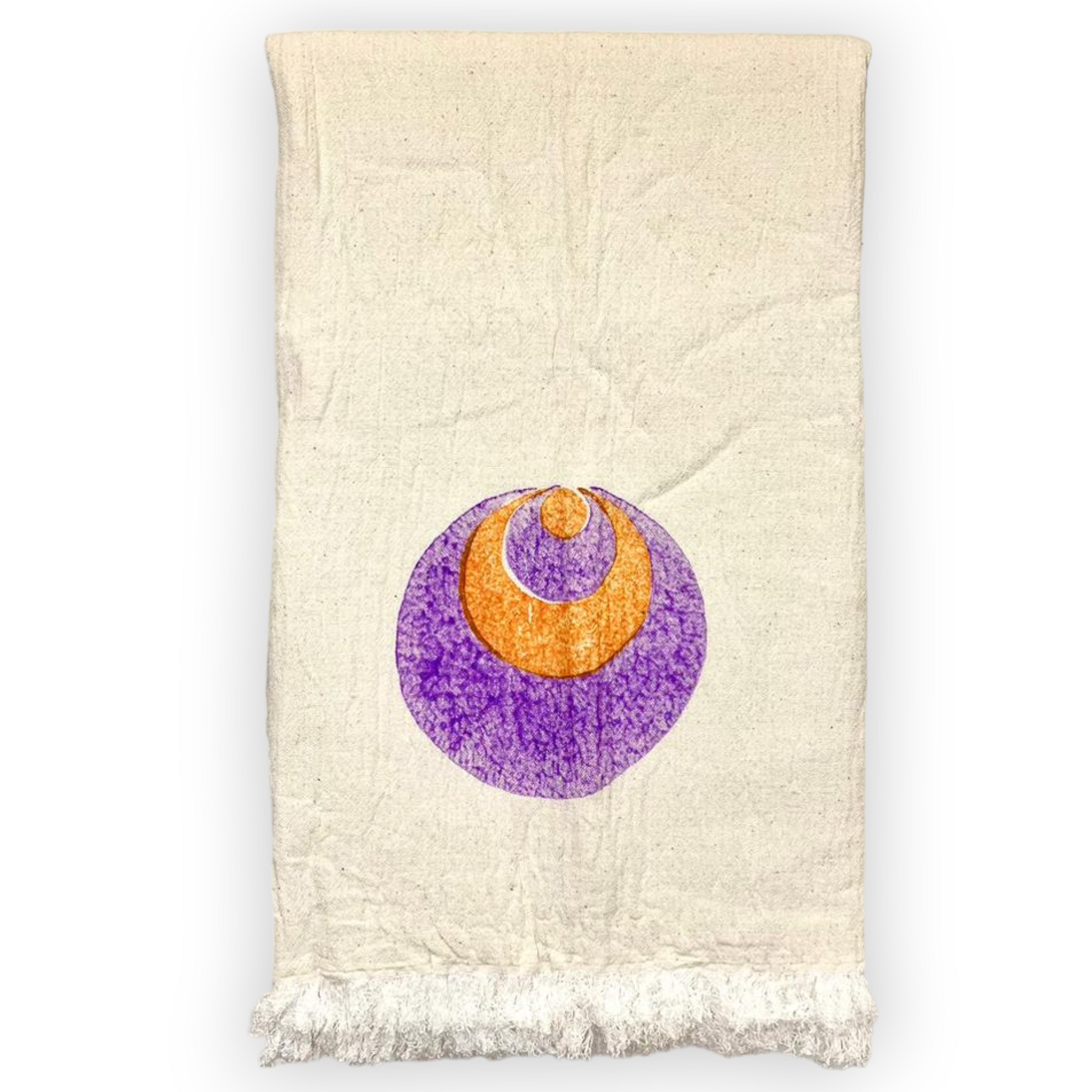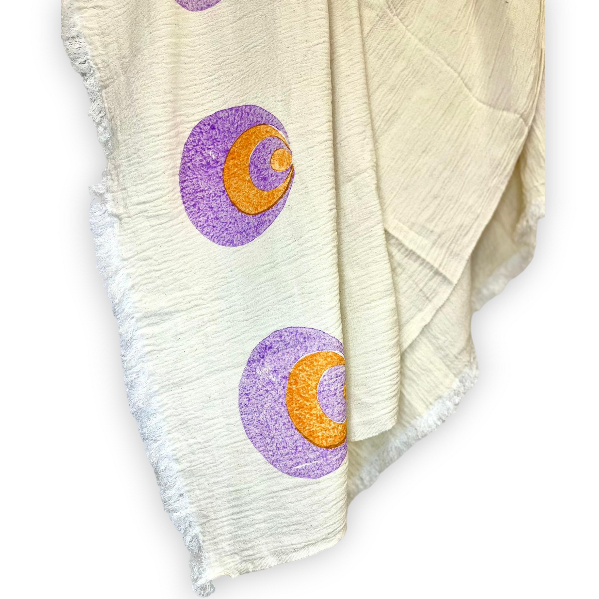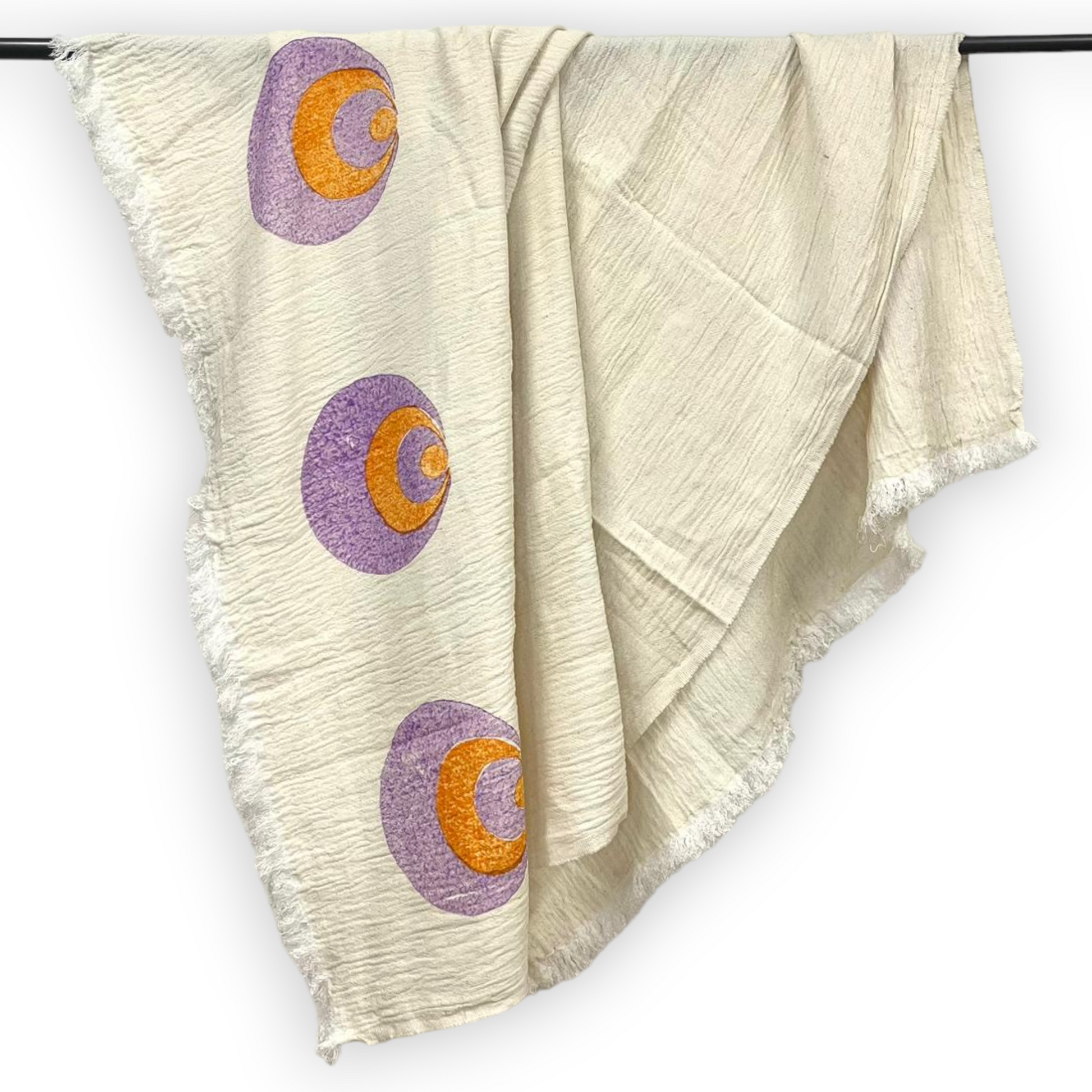 It has purple and orange natural dye handprints on a beautiful ecru base.