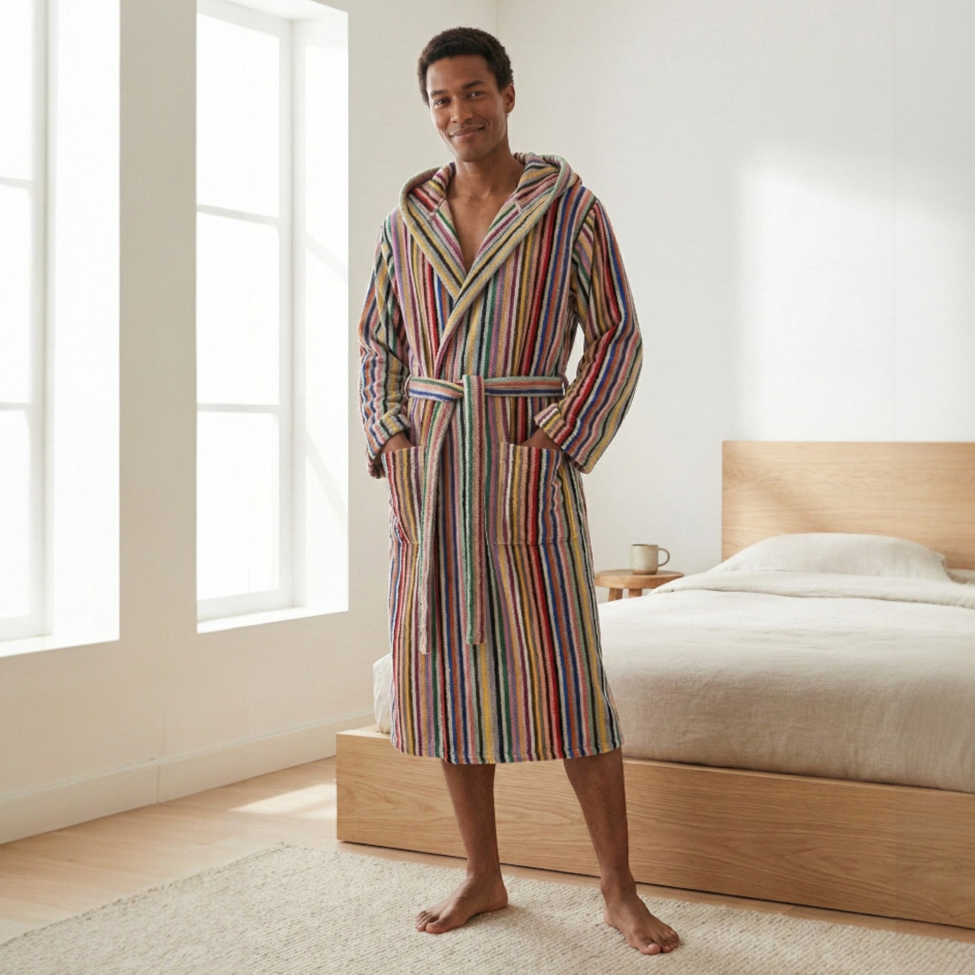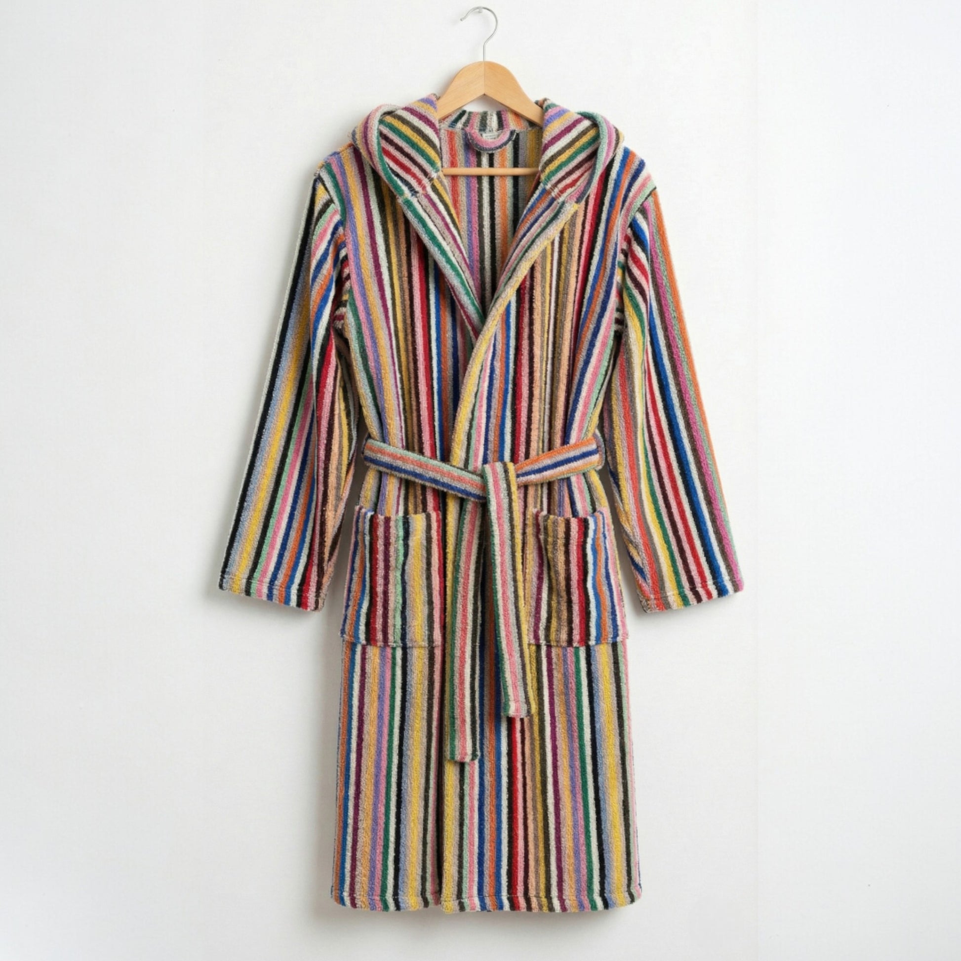 Handwoven Hooded Turkish Terry Bathrobe — Multi Color Stripe Design Hooded
