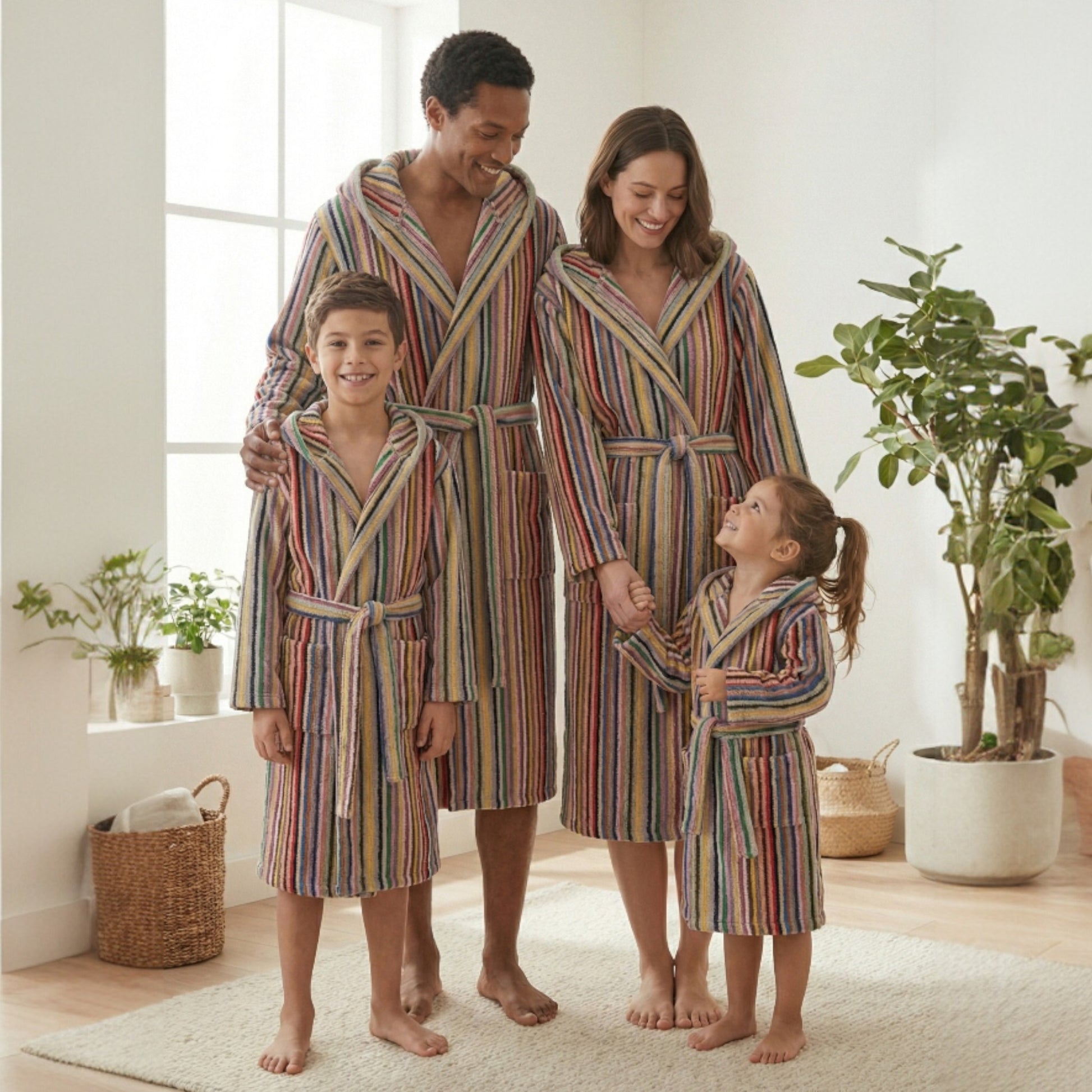 Handwoven Hooded Turkish Terry Bathrobe, Multi Color Stripe Design Hooded, Premium Natural Cotton, Slow Fashion, 30 Years of Craftsmanship