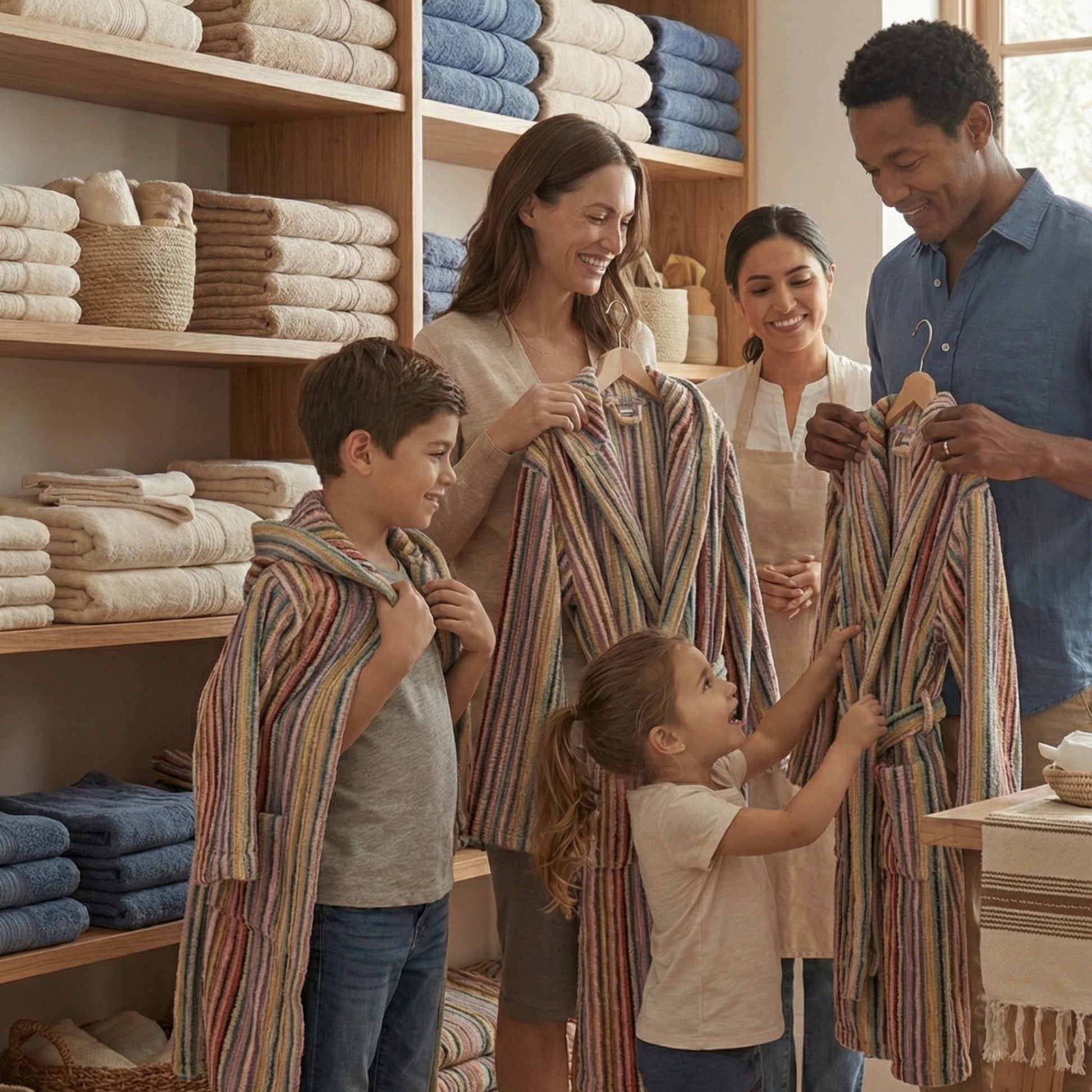 ✔ Matching bath towels, hand towels, bath mats, and kids bathrobes available