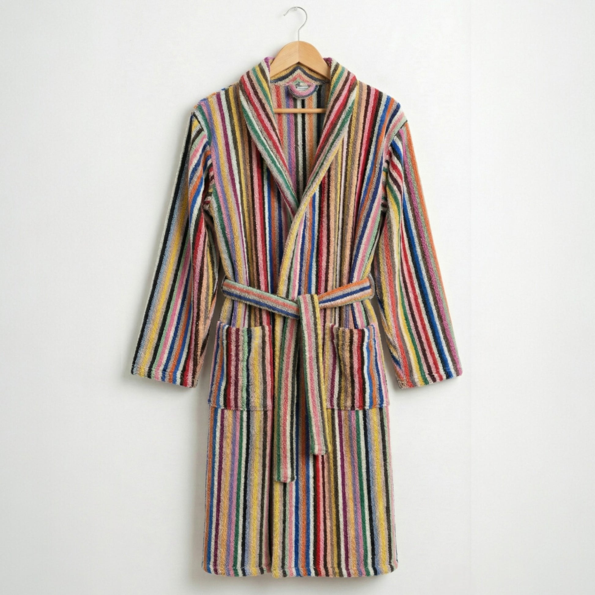 Handwoven Turkish Terry Bathrobe, Multi Color Stripe Design Shawl Collar, Premium Natural Cotton, Slow Fashion, 30 Years of Craftsmanship
