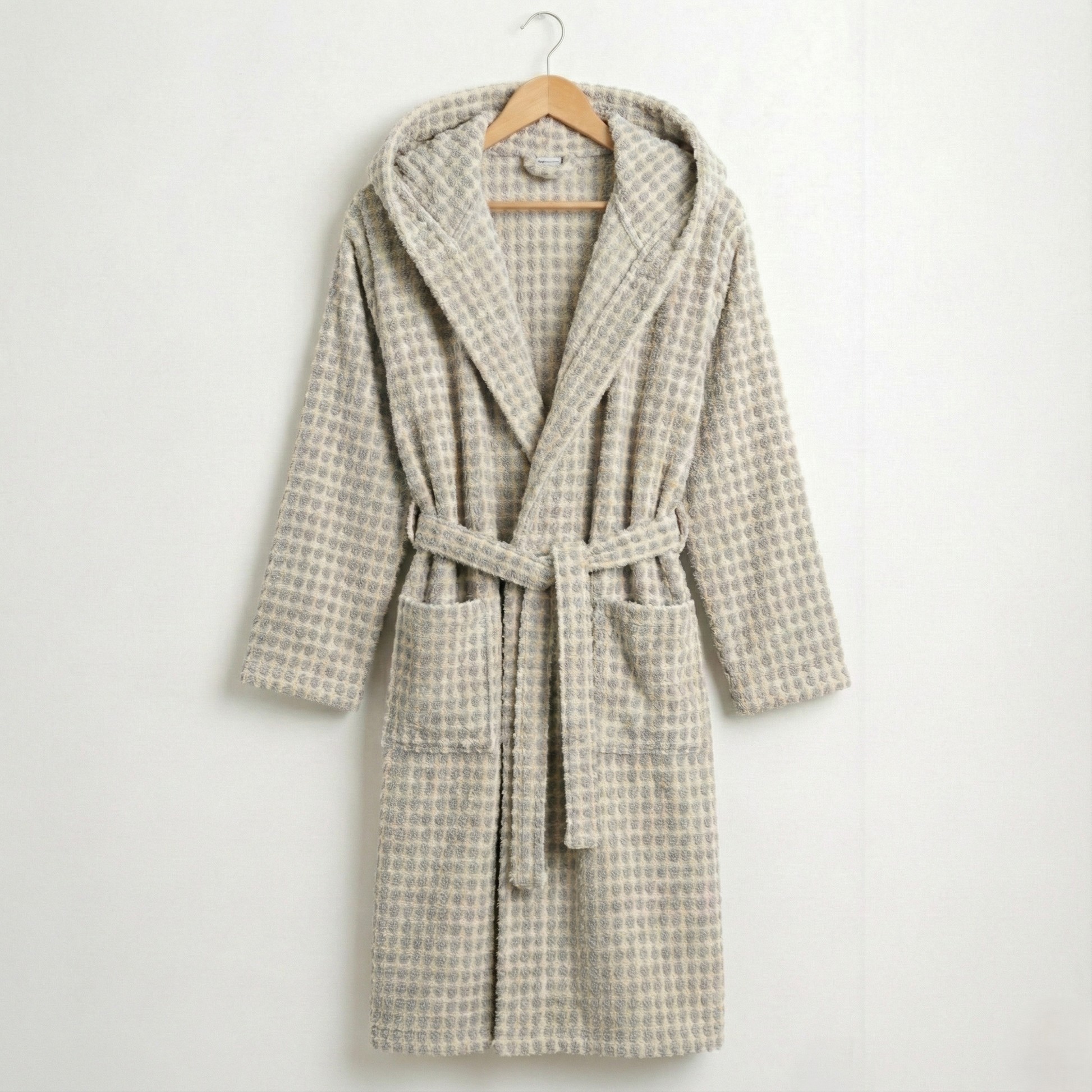 Handwoven Turkish Terry Bathrobe — Grey Dotted Hooded