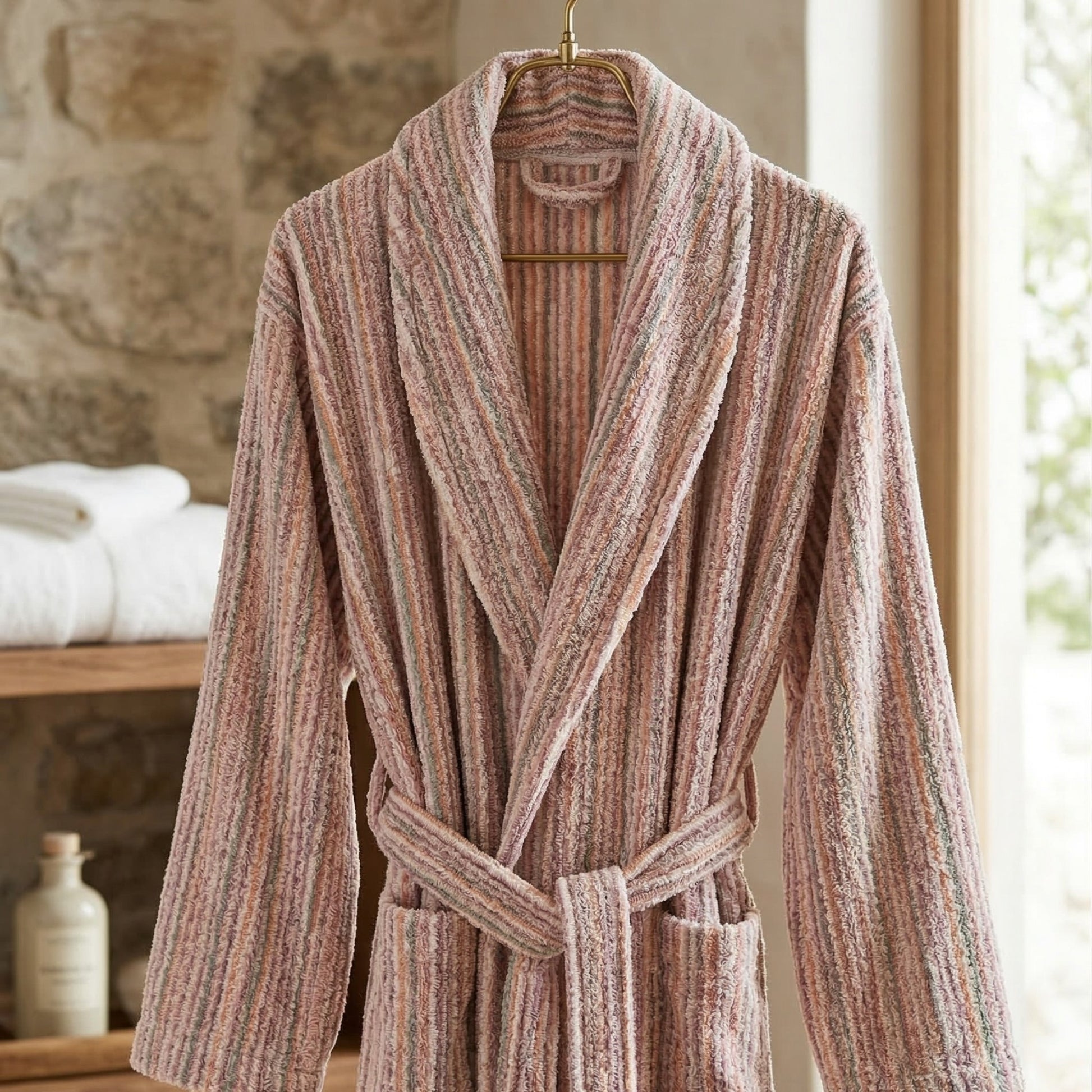 Each bathrobe is handwoven and handmade by skilled artisans, making every piece unique. The textured terry weave, elegant shawl collar, deep pockets, and adjustable belt create a bathrobe that feels luxurious while staying natural and timeless.