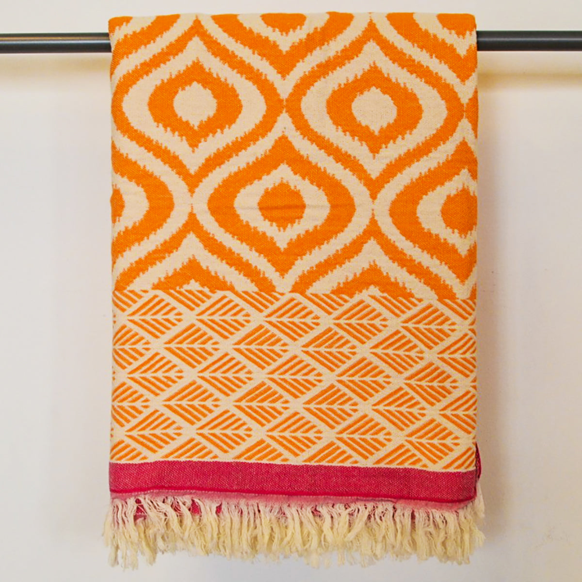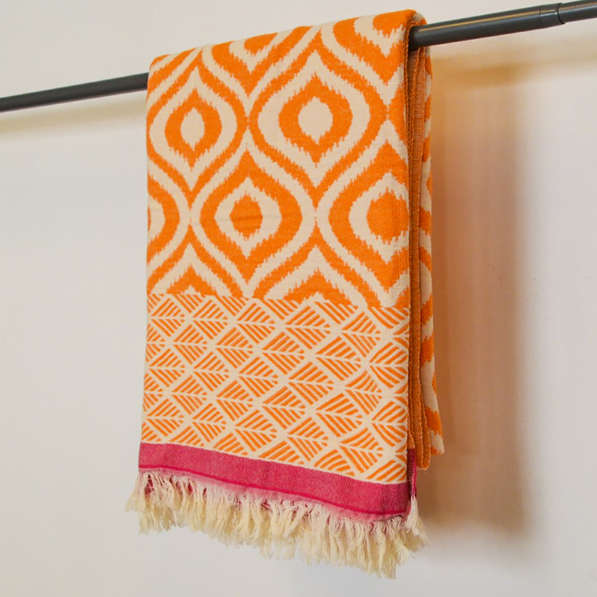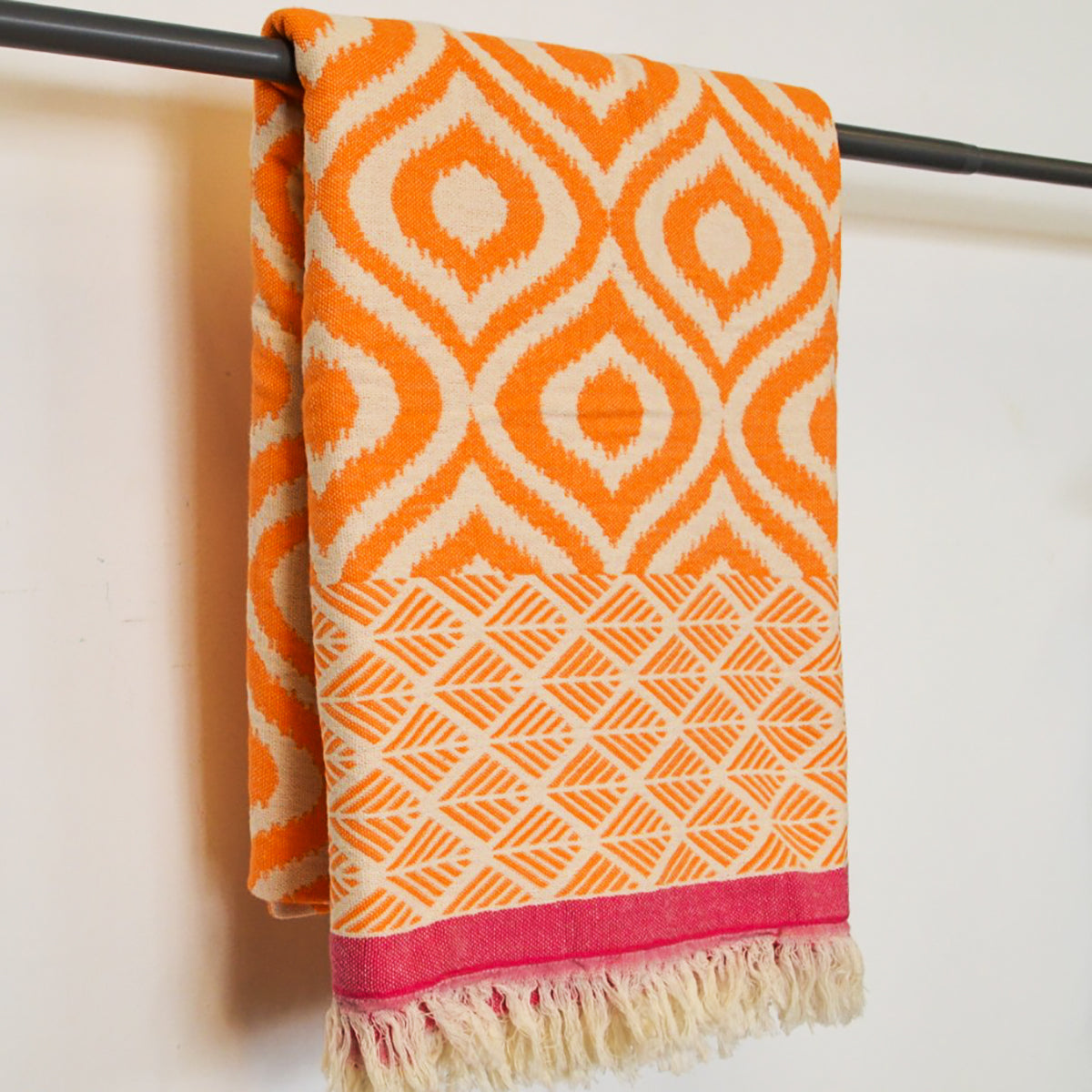 Ikat Design Turkish Towel Throw Blanket Orange is made of 100% Premium Quality Turkish Cotton. It is a fantastically absorbent and quick-drying bath sheet. This soft-touch jacquard fabric will look stunning on your interior.