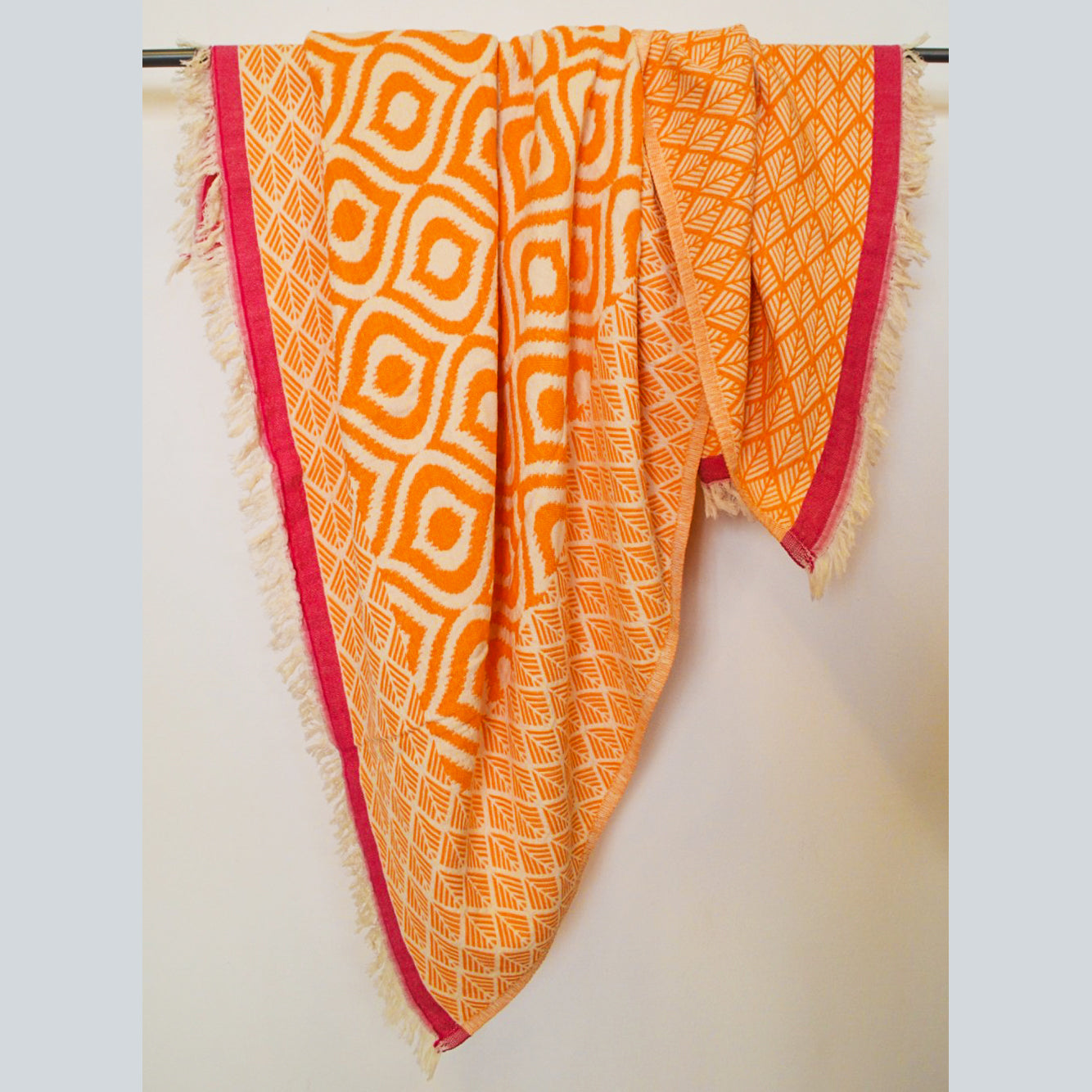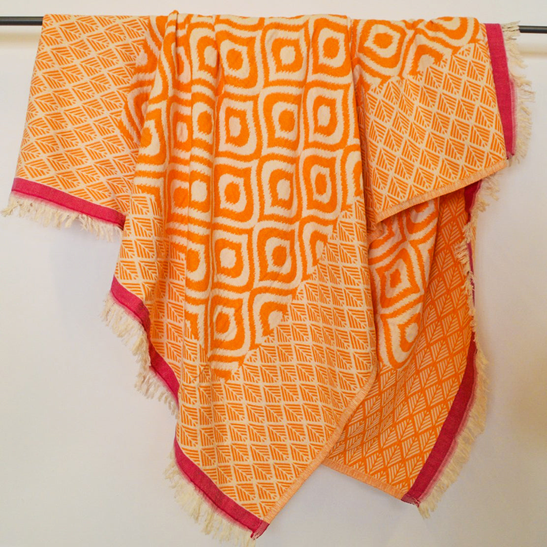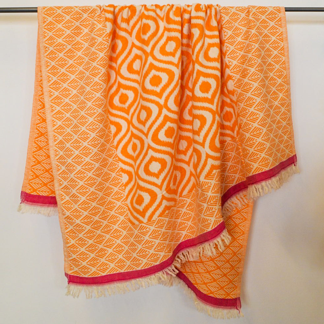 Ikat Design Turkish Towel Throw Blanket Orange is made of 100% Premium Quality Turkish Cotton. It is a fantastically absorbent and quick-drying bath sheet. This soft-touch jacquard fabric will look stunning on your interior.