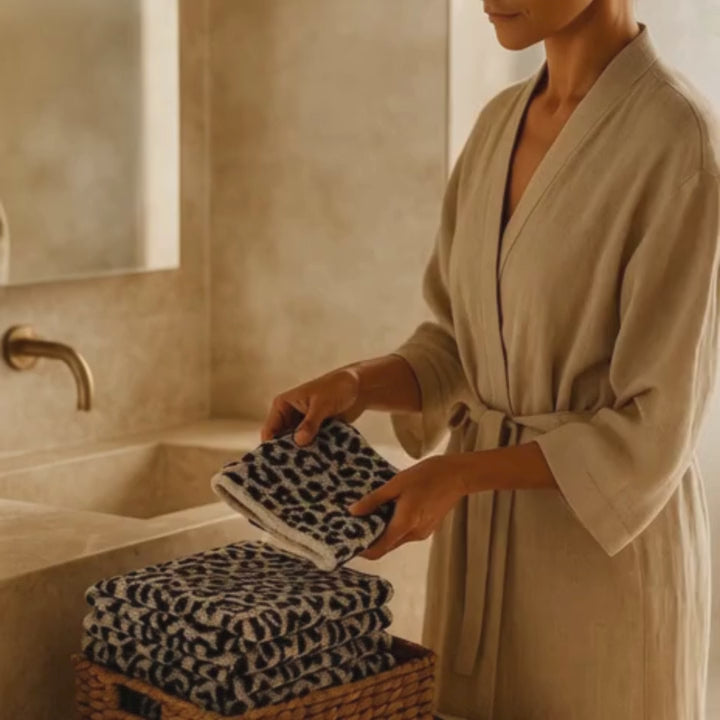 Bring a touch of wild elegance to your daily rituals with our Leopard Design Hand & Face Towel Collection.