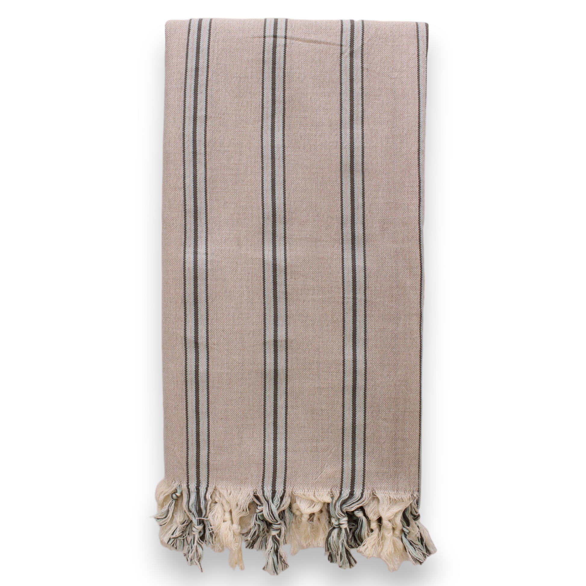 This pure Linen Turkish Towel Pestemal has a beautiful brown base with blue stripes at the edges.