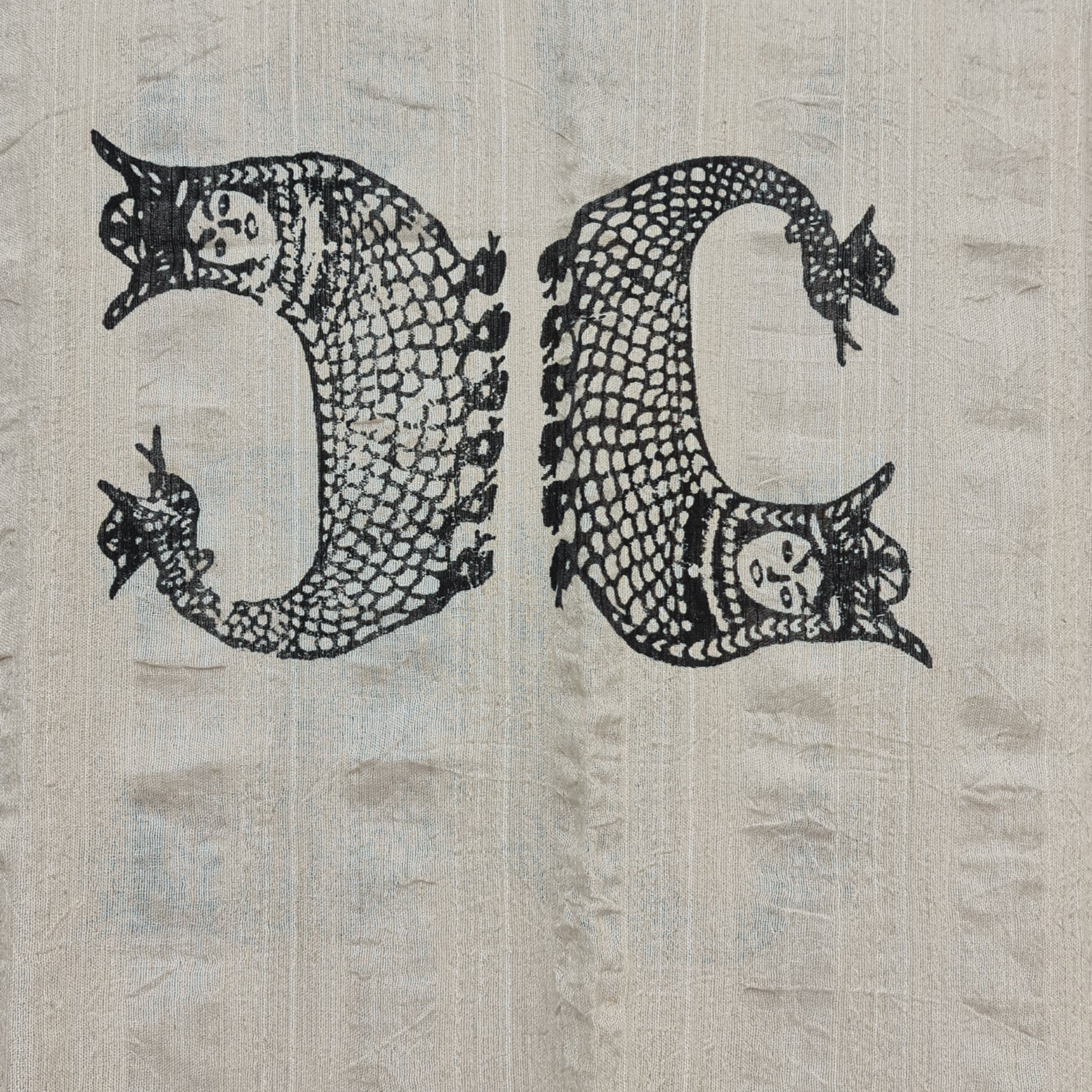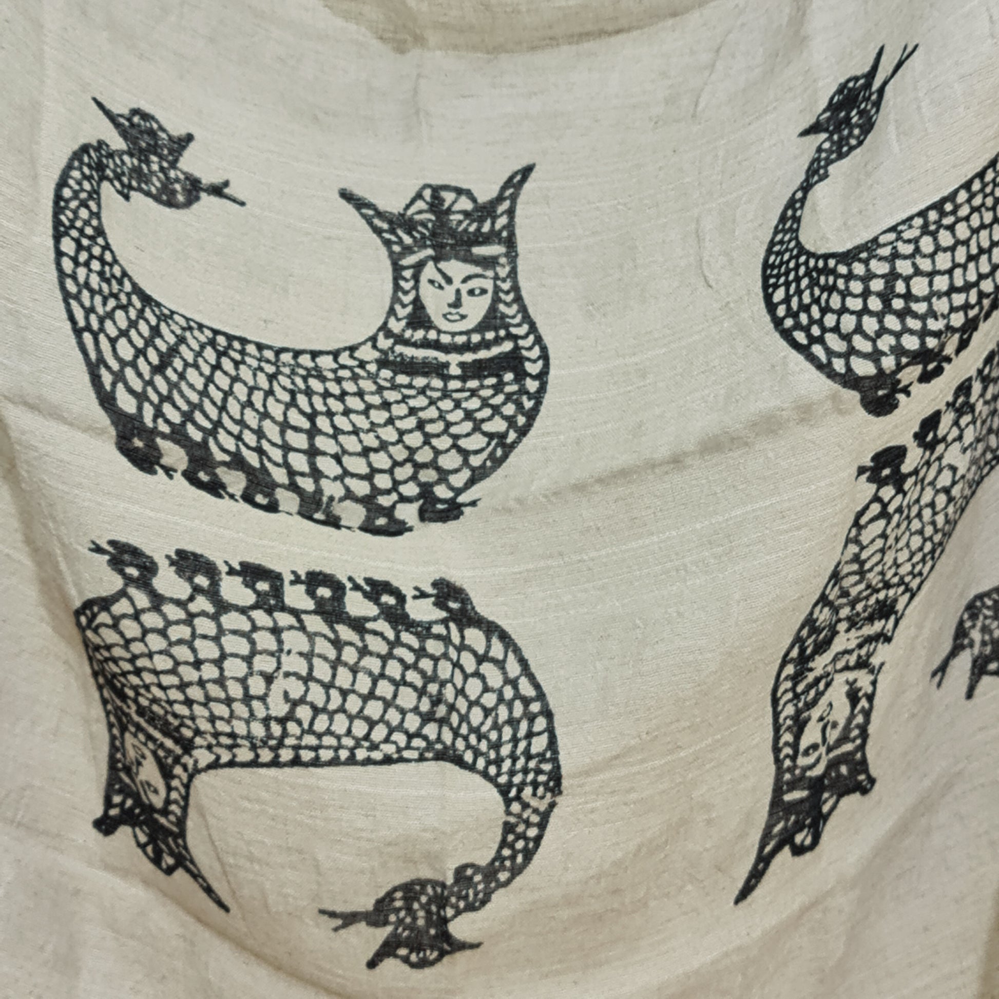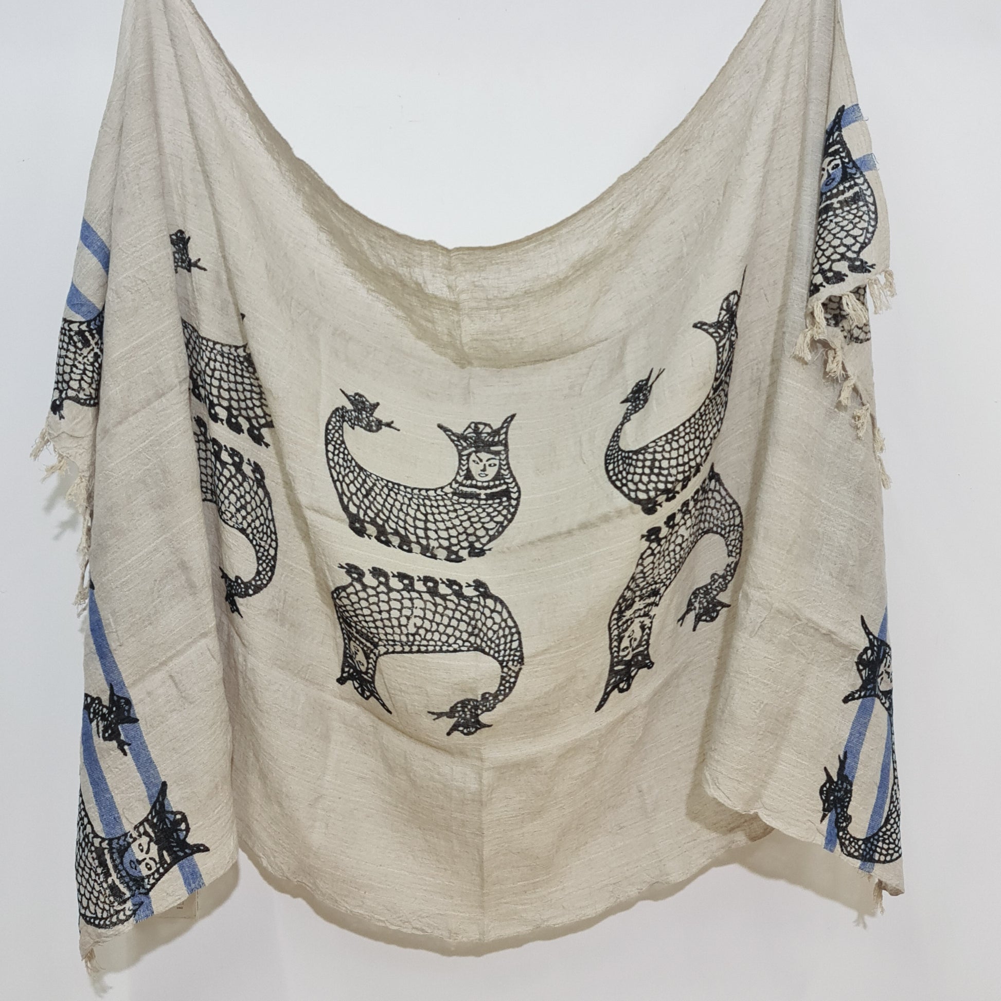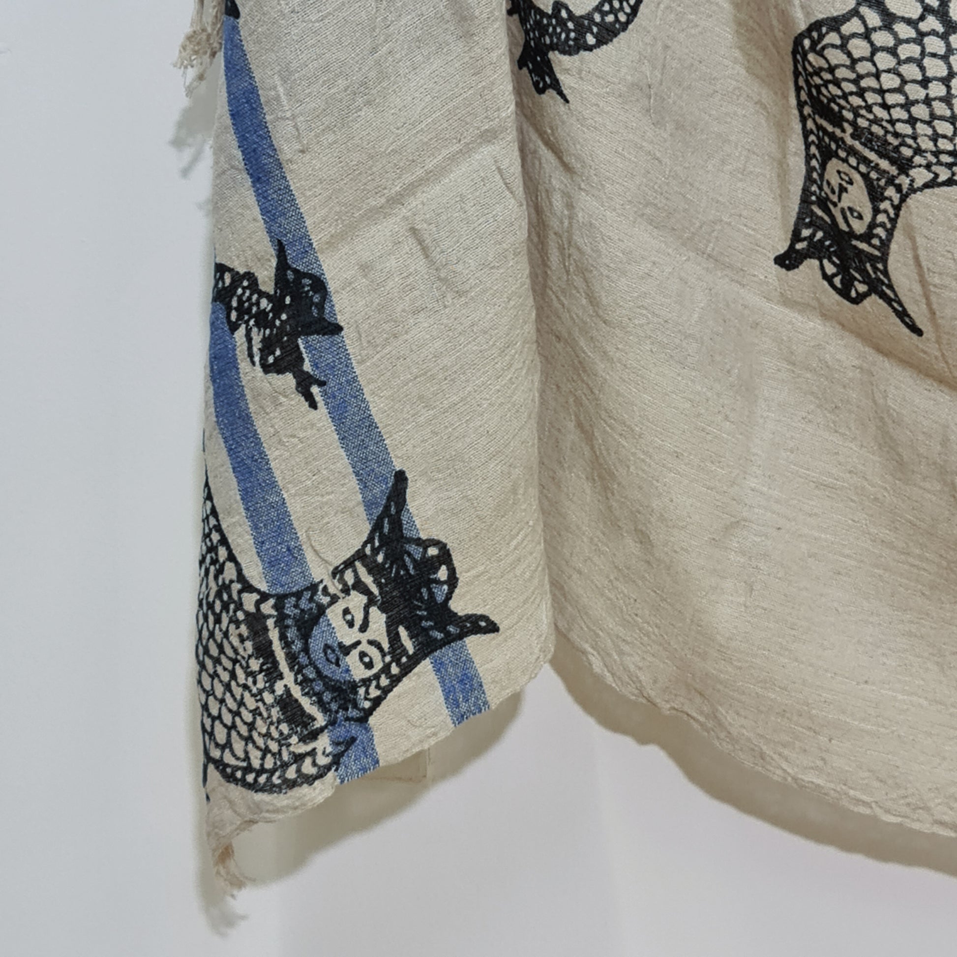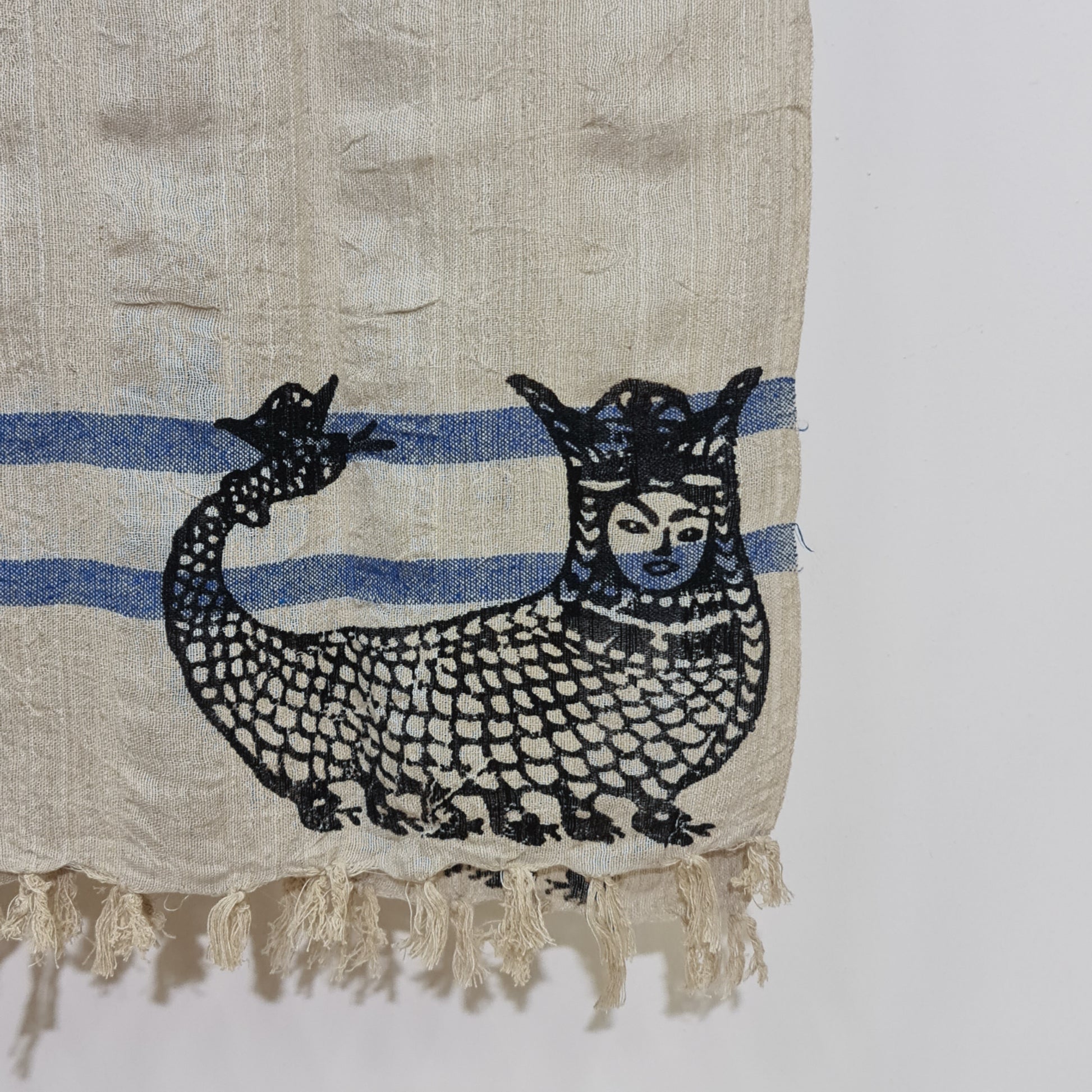 This pure Linen Turkish Towel Pestemal Shahmaran Pattern has a beautiful ecru base with black stripes at the edges. There are handprint black Shahmaran patterns all over it.