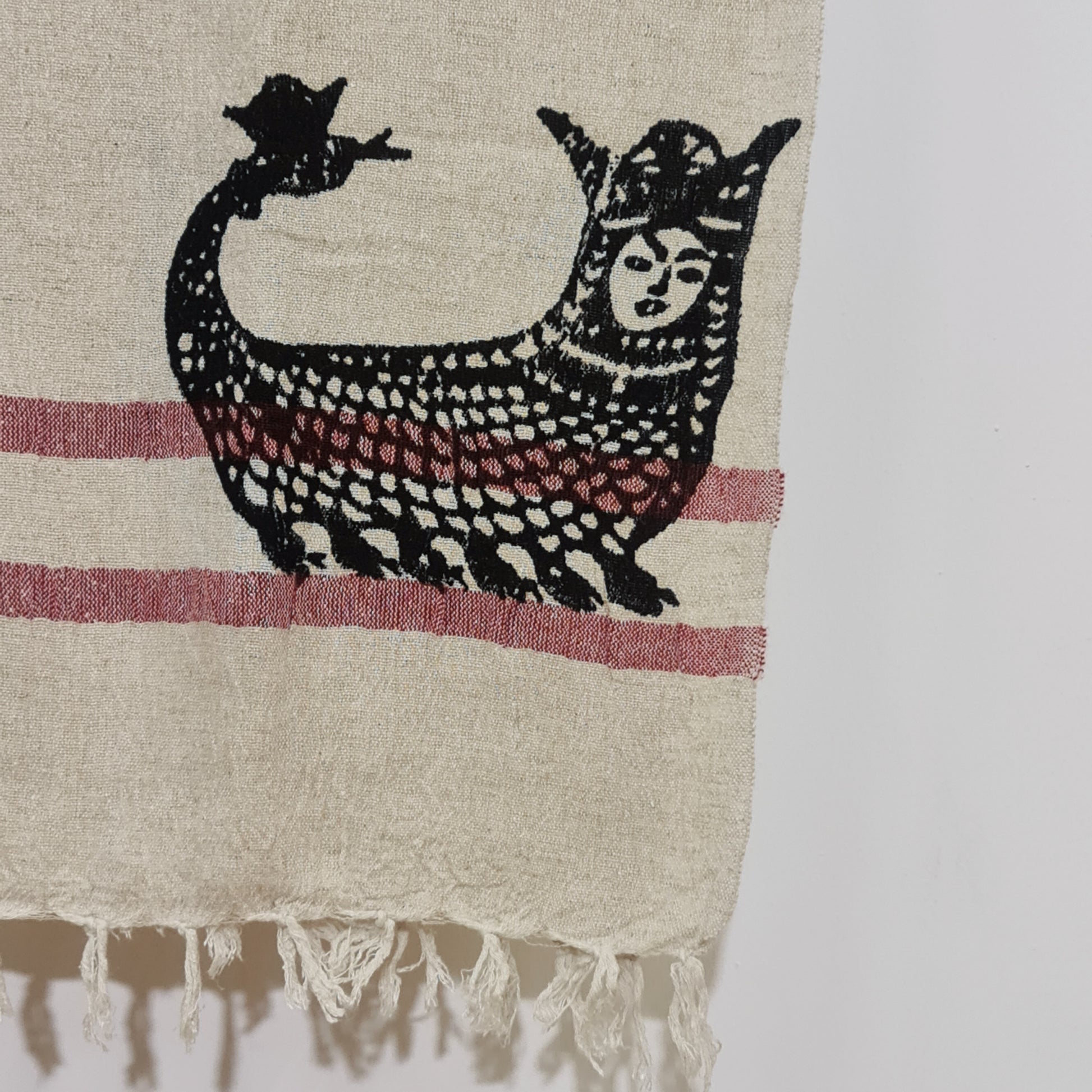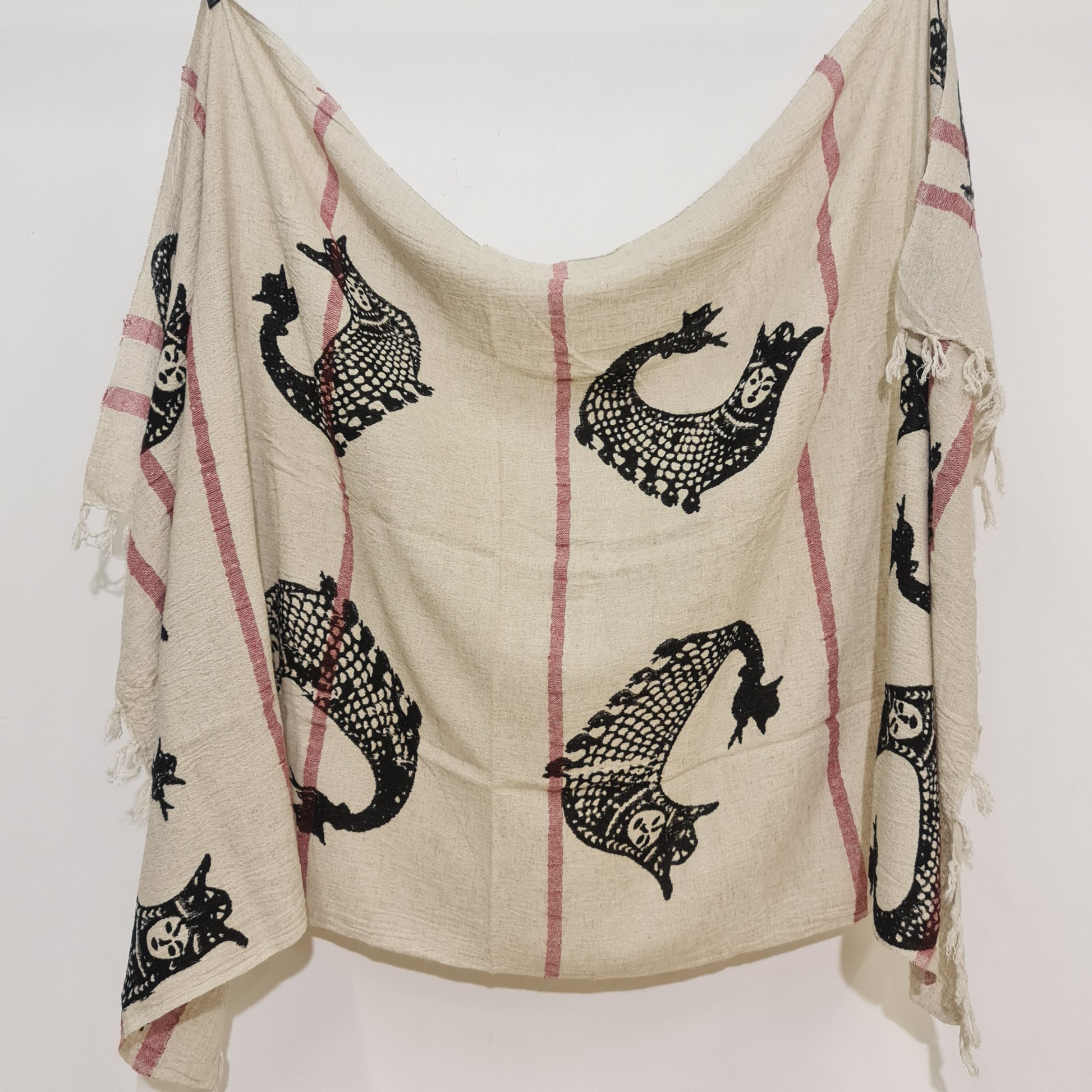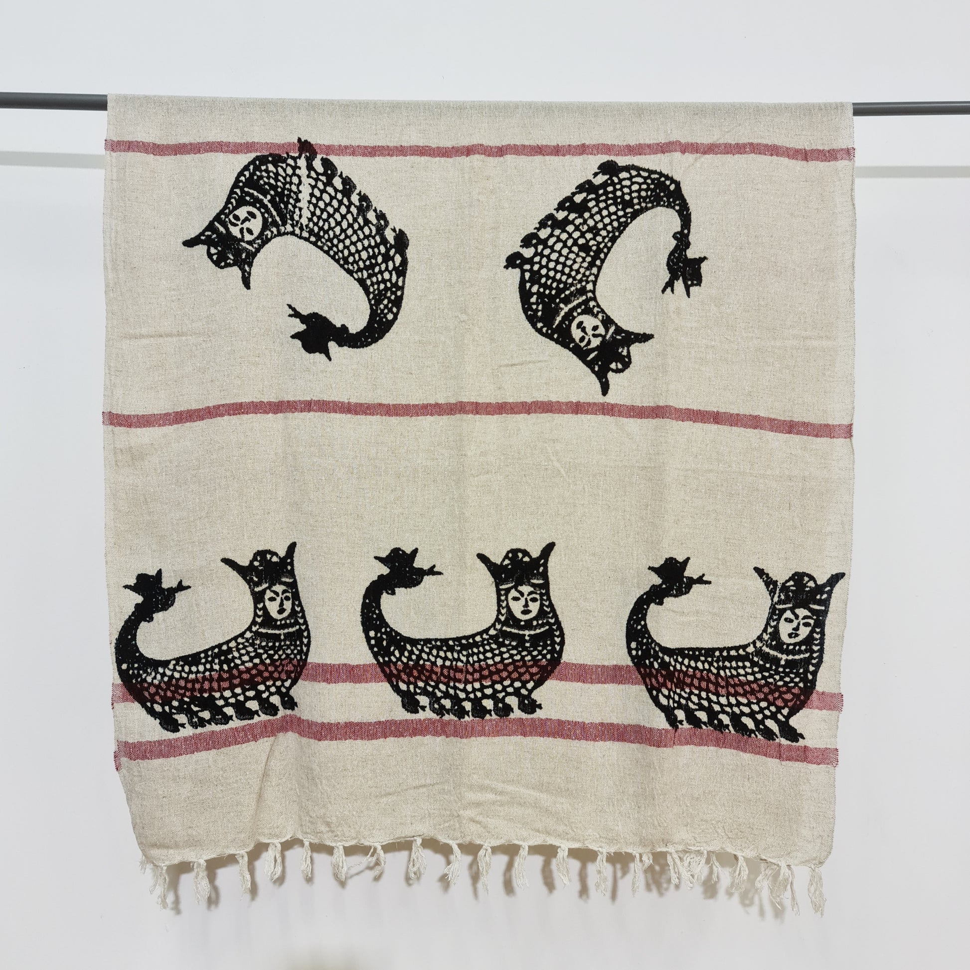 This pure Linen Turkish Towel Pestemal Fish Pattern has a beautiful ecru base with black stripes at the edges. There are handprint black Fish patterns all over it.