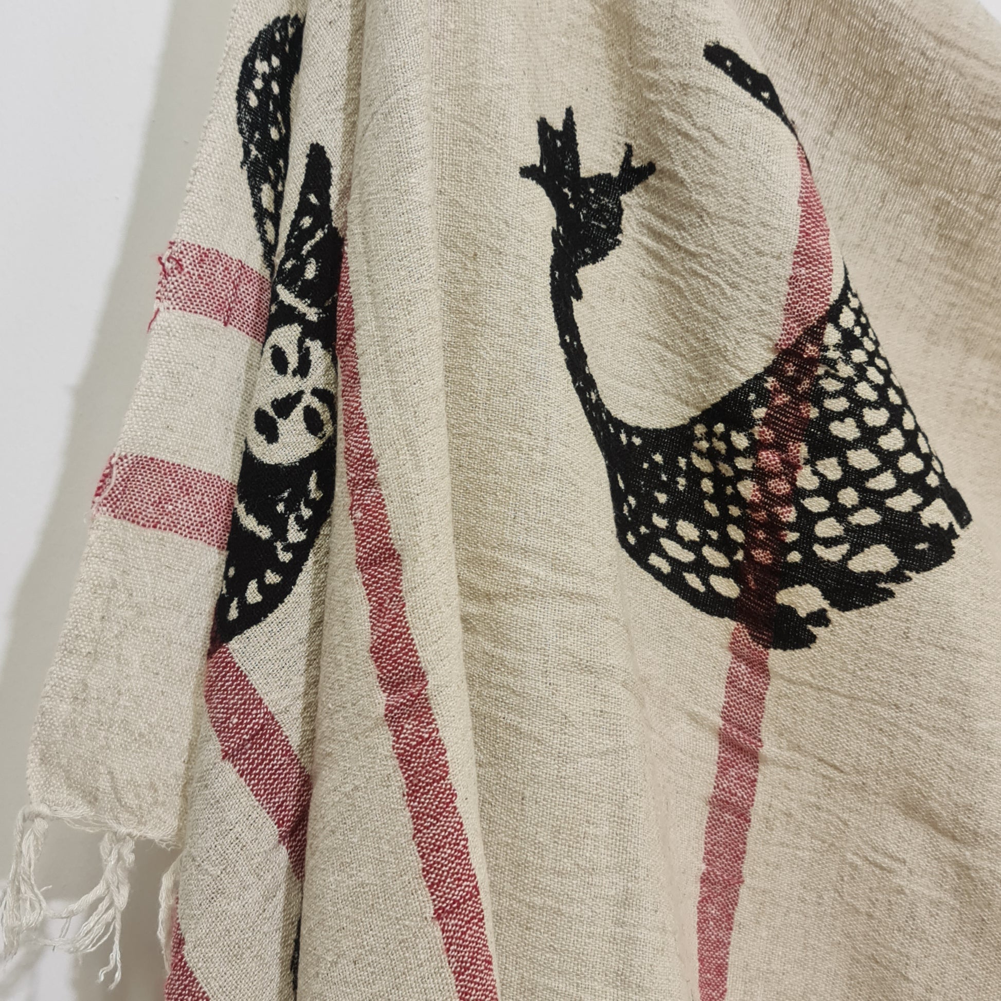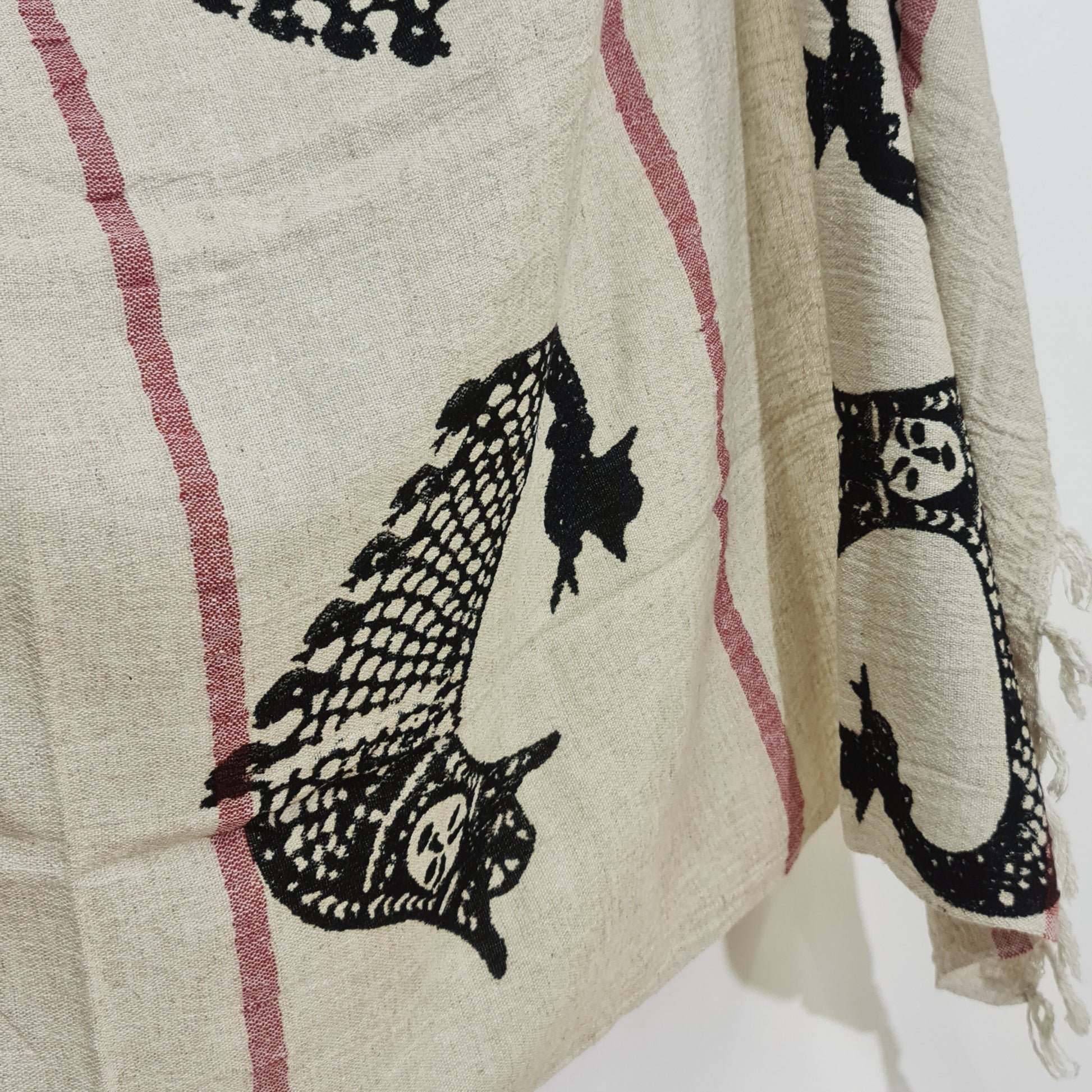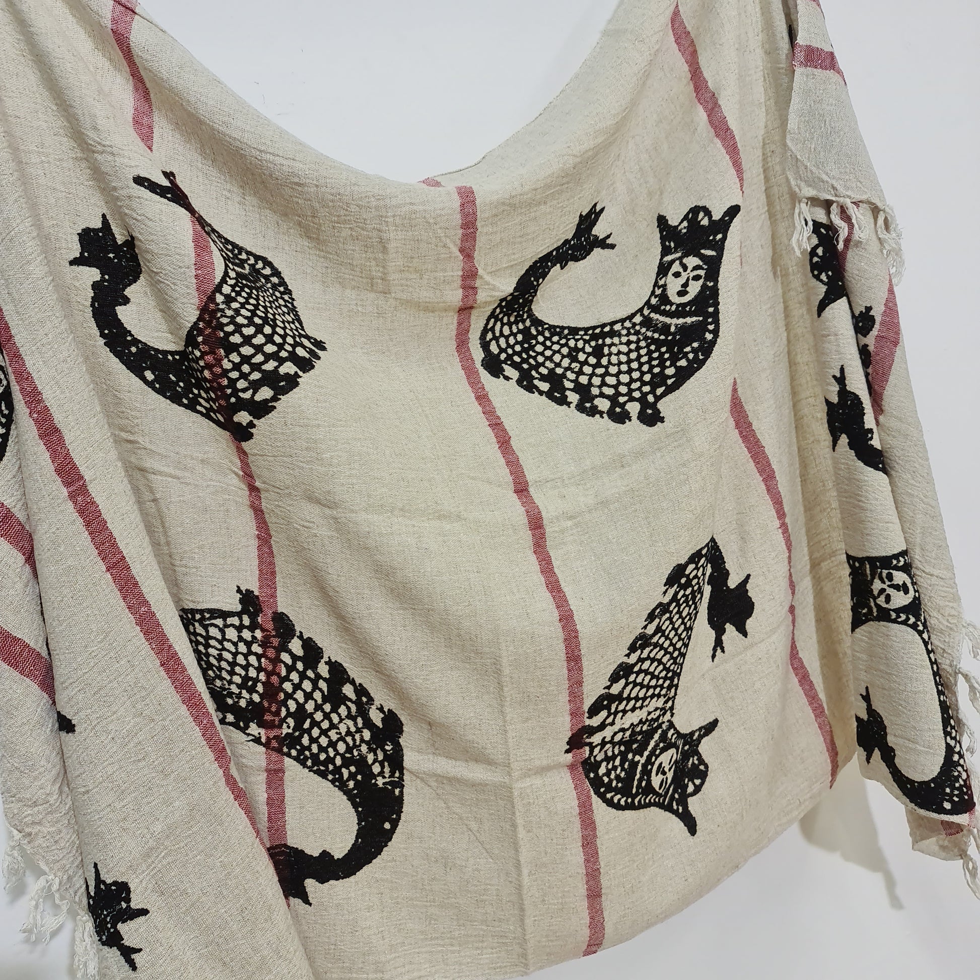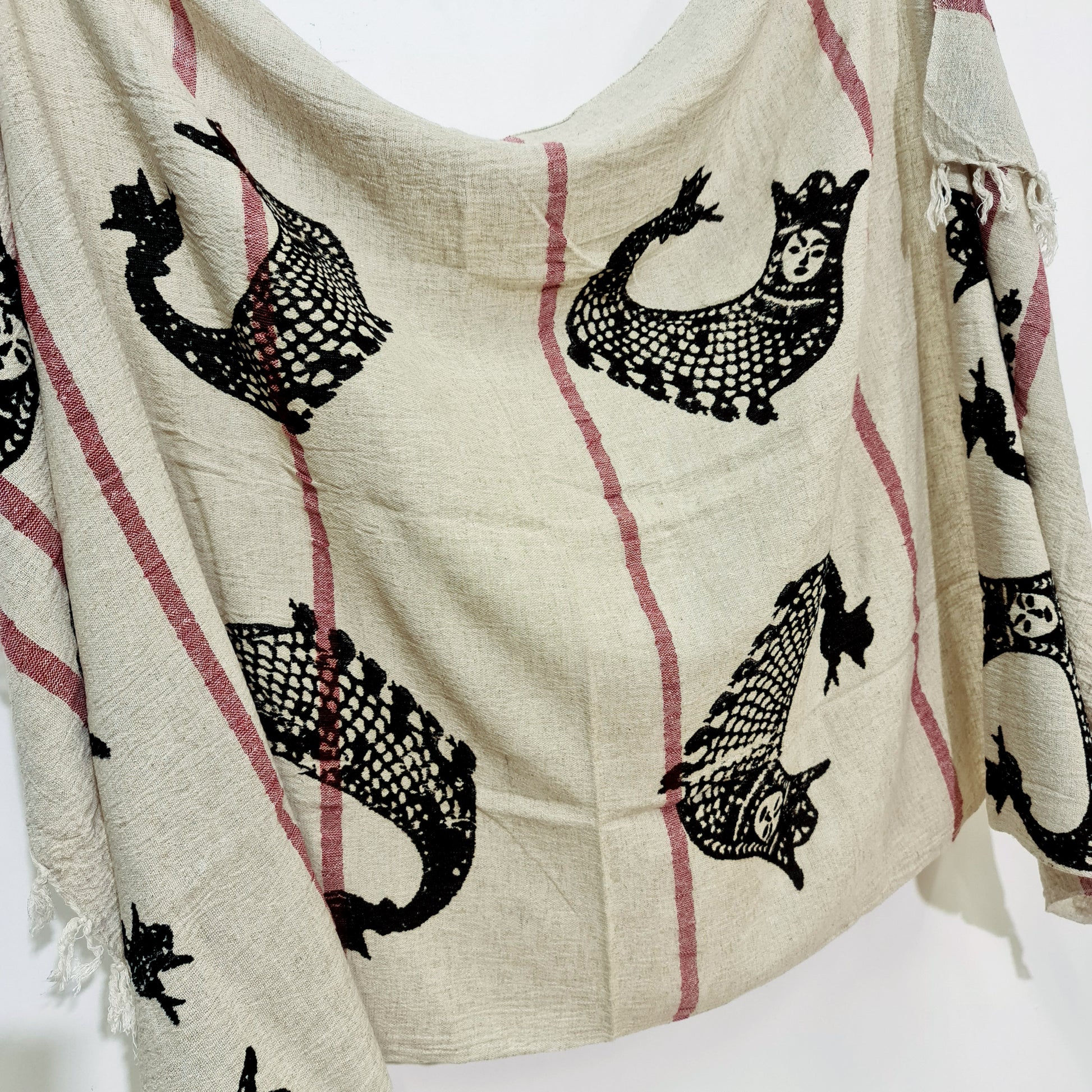This pure Linen Turkish Towel Pestemal Fish Pattern has a beautiful ecru base with black stripes at the edges. There are handprint black Fish patterns all over it.