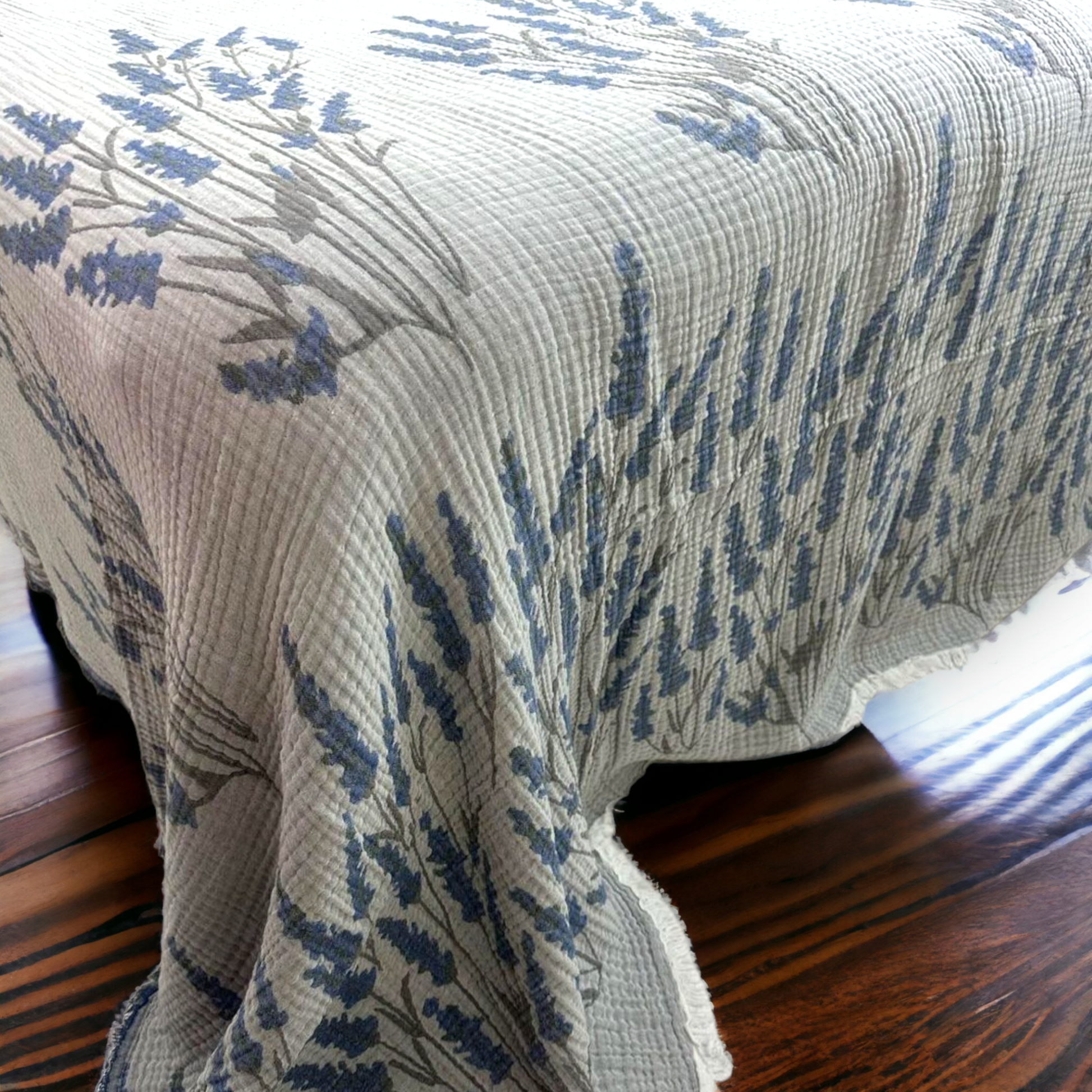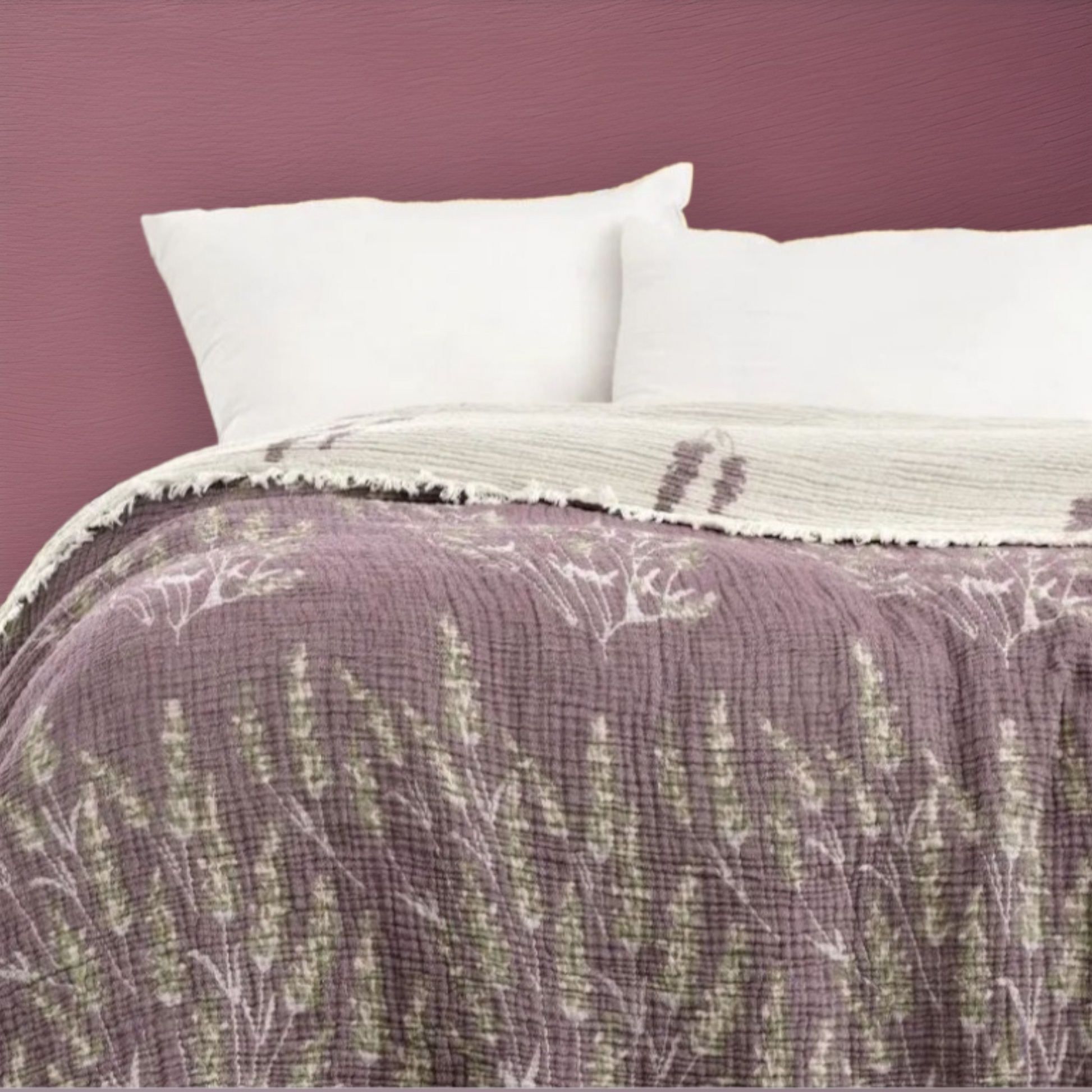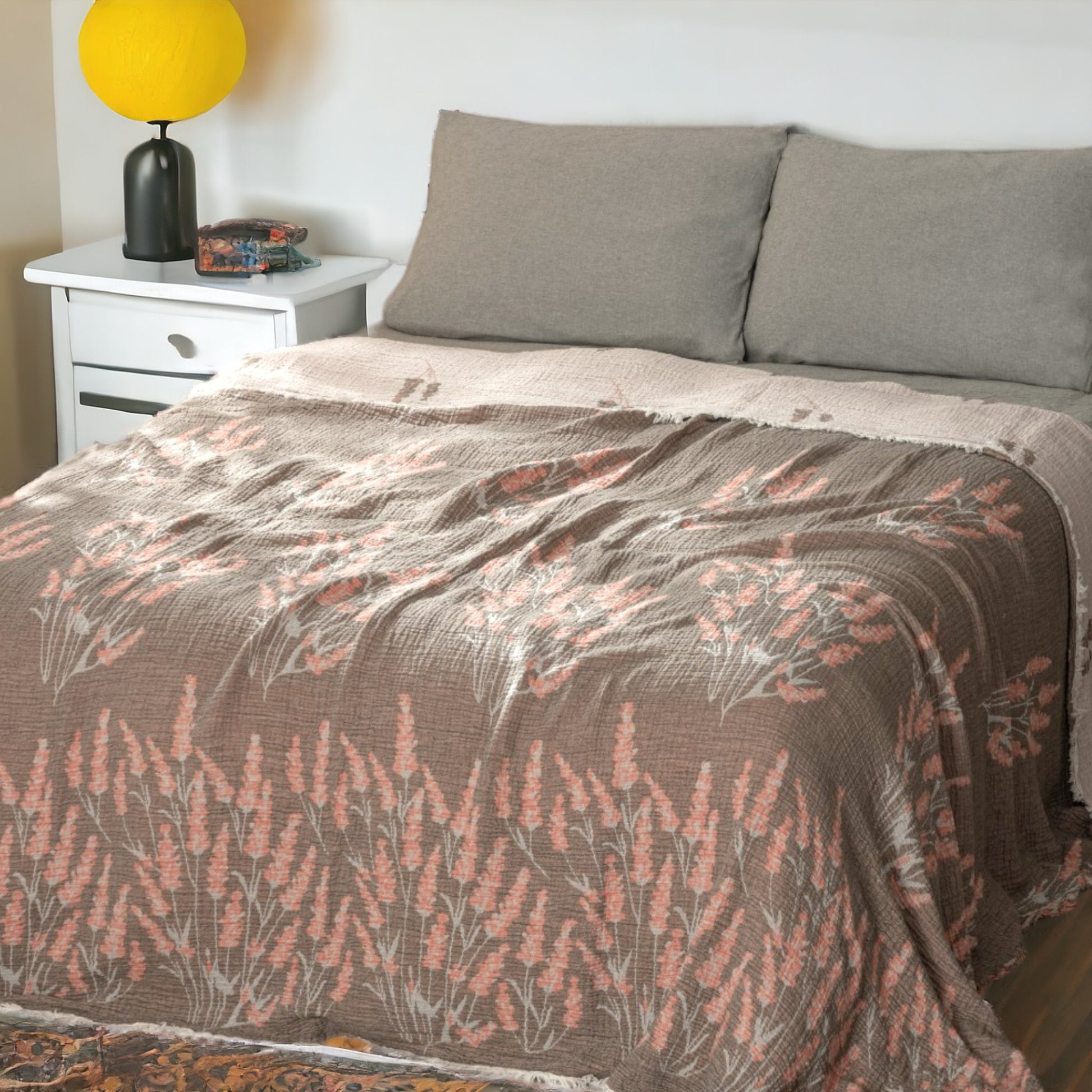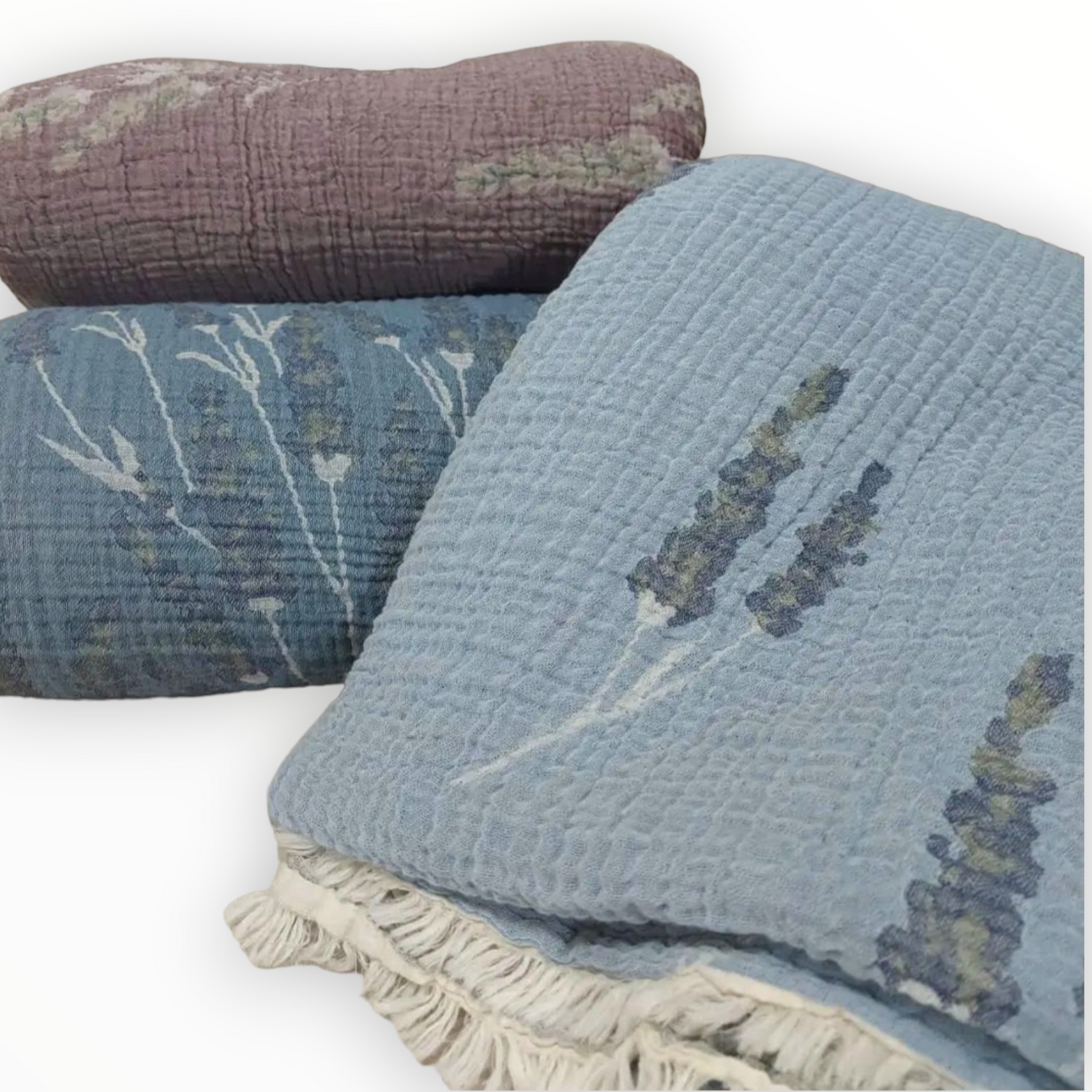 Embrace the natural, soft, and stylish touch of our Premium Quality Organic Cotton Lavender Design Muslin Hand Made Blanket Bed Cover. 🌸🛏️