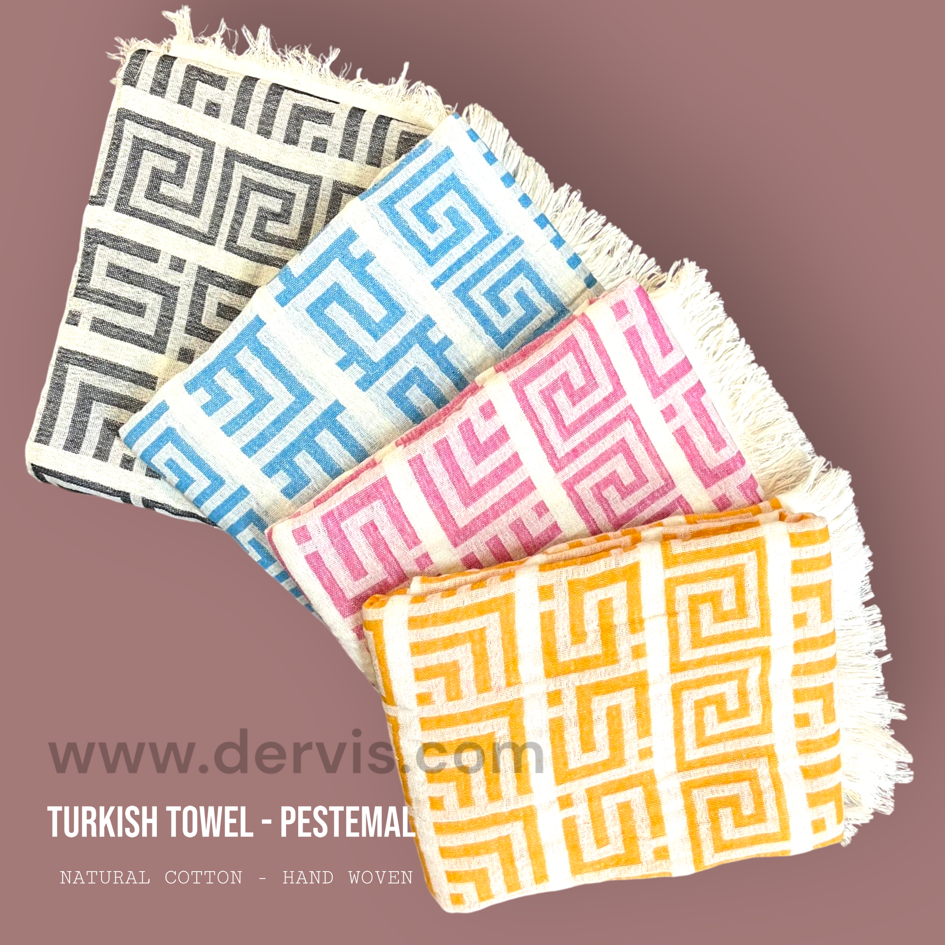 All of our original Natural Cotton Muslin Turkish Towel Pestemals are hand-woven in Turkey using only 100% Premium Quality Natural Turkish Cotton Yarns. Lightweight, super soft, and absorbent. They are ideal for travelers, make excellent bath towels or beach blankets, and can even be worn as a fashion accessory. All of them have hand tied fringe. Turkish towels naturally soften after each use and wash.