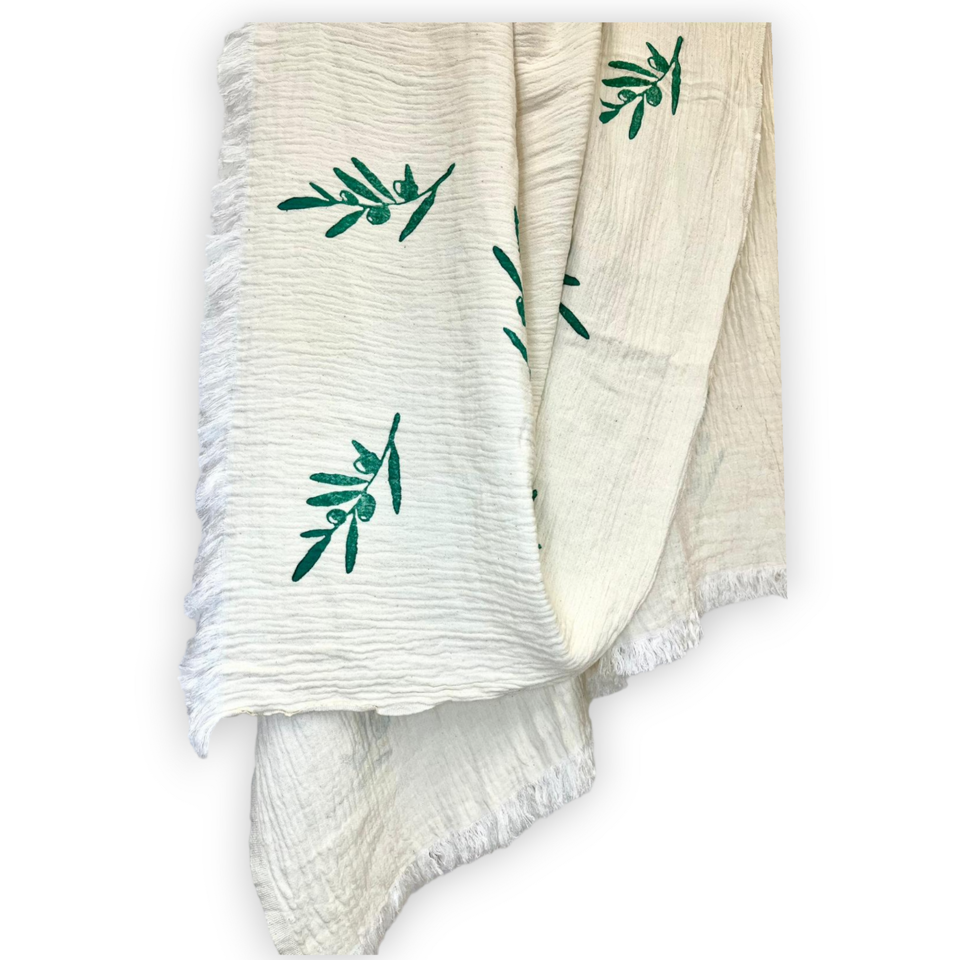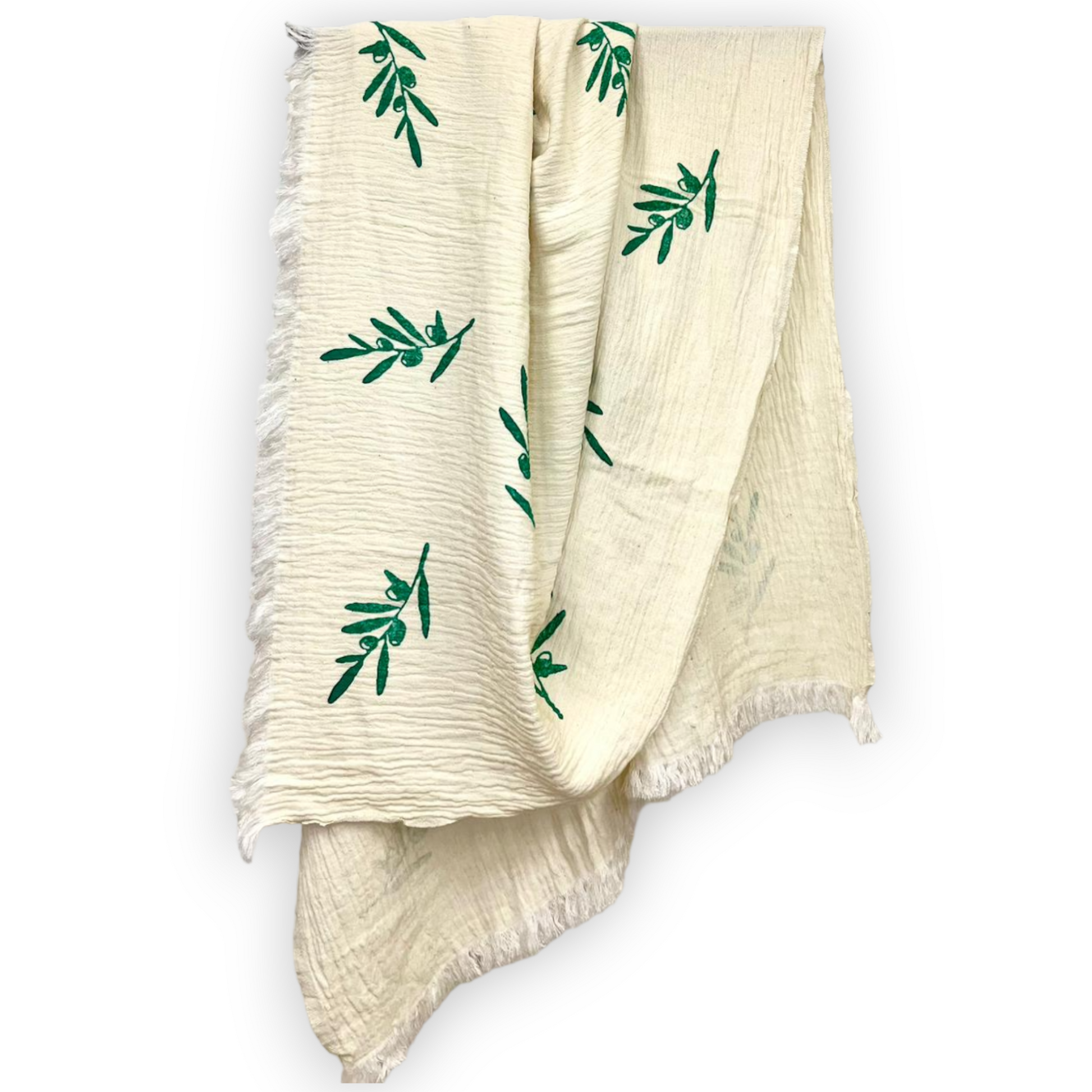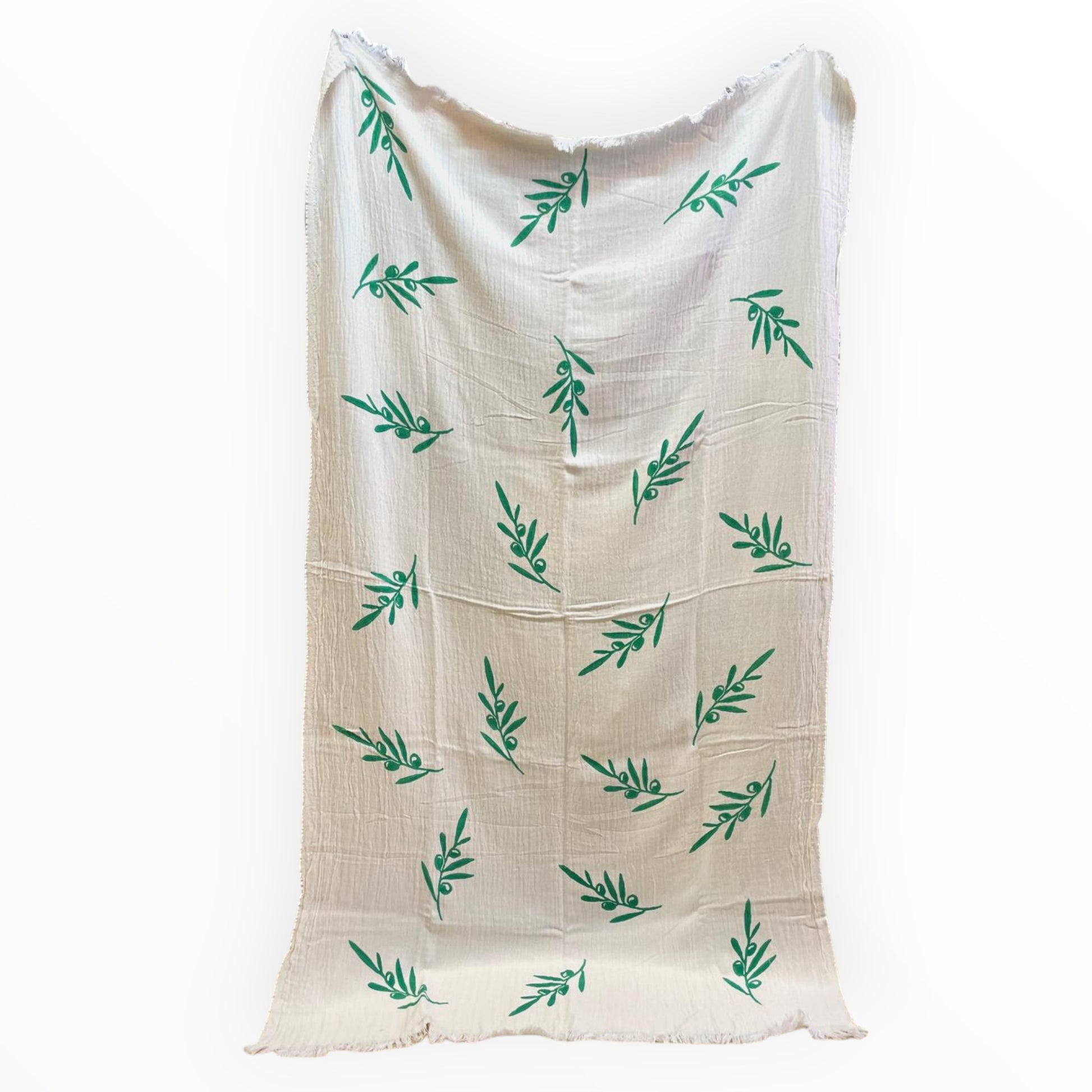 Olive Branch Turkish Towel Pestemal - Beach Towel is made of Double Layers Natural Cotton Muslin. All the Olive Branch patterns are Hand printed with Wood Stamps and Natural Dye.